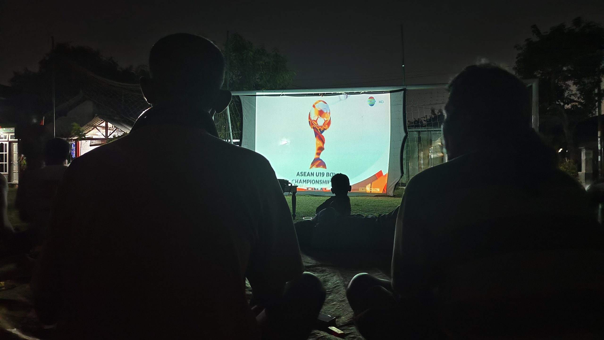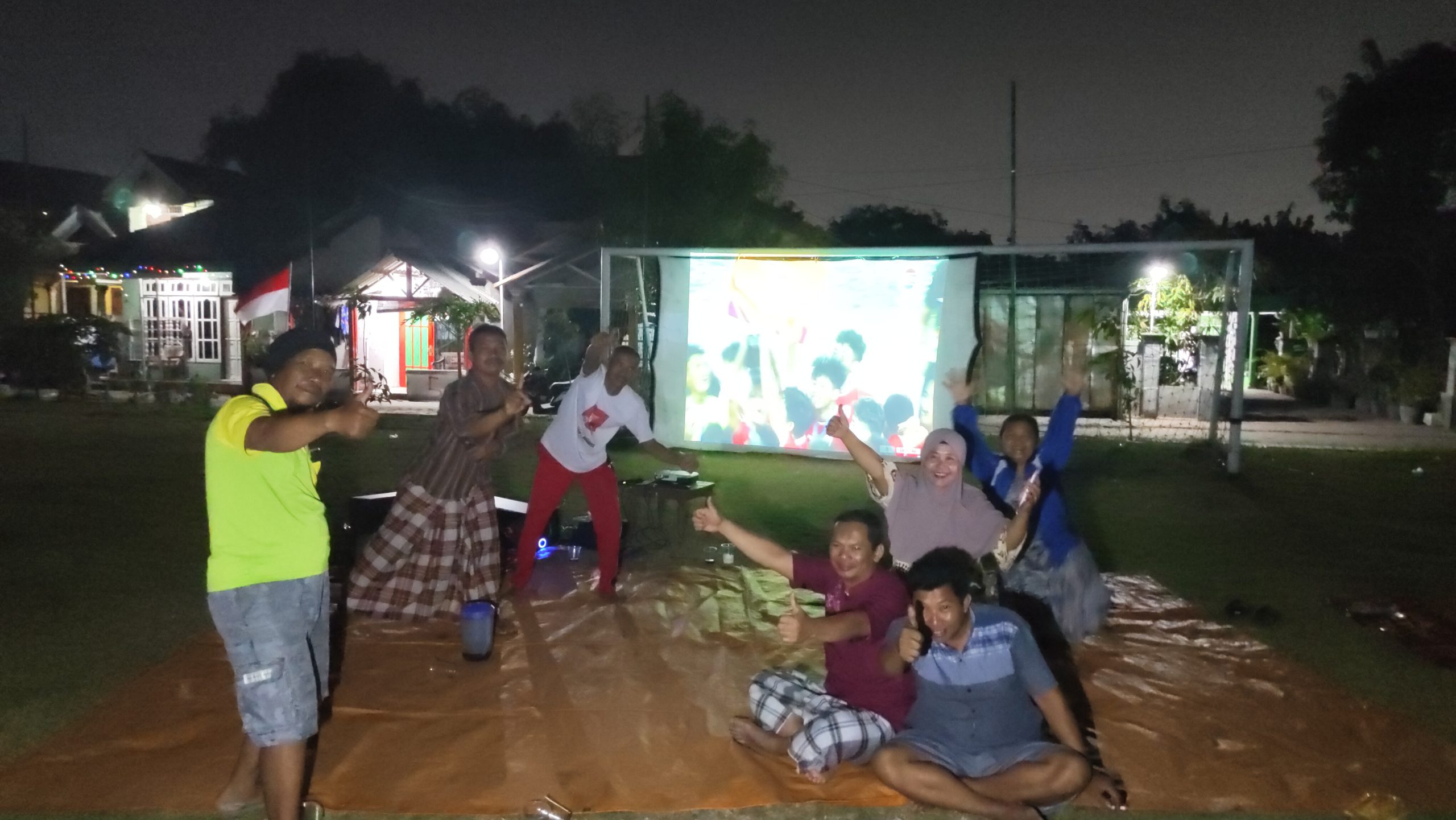 Pukul 18.00 WIB, Seniman bersama warga lain mulai memasang Layar putih di gawang lapangan tersebut. Begitu proyektor menyala, warga sekitar pun mulai berdatangan , meskipun mendadak ternyata animo warga sangat tinggi mulai dari anak anak, remaja, ibu ibu dan bapak bapak pun duduk di rumput beralaskan terpal.