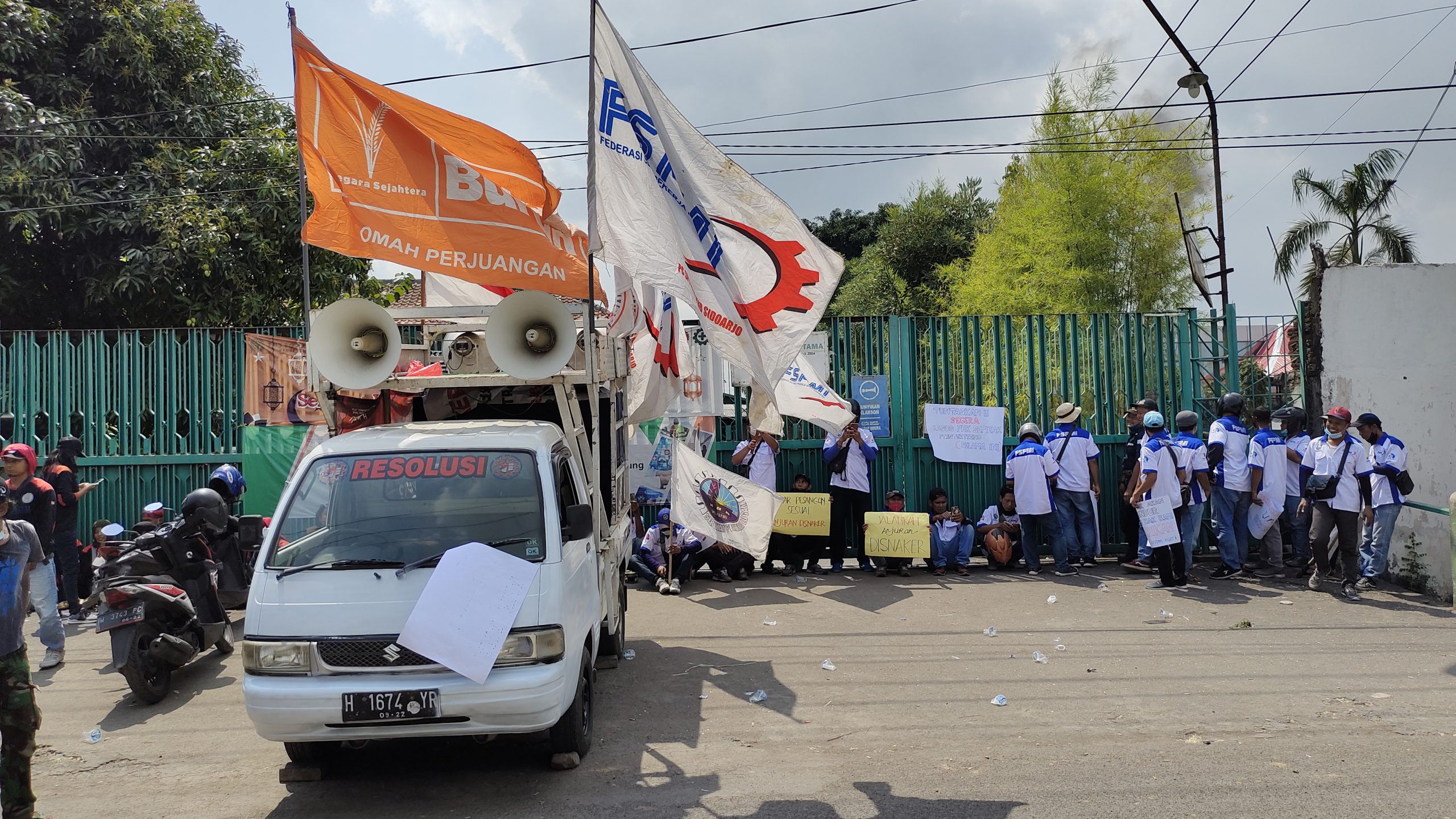 Tampak satu mobil Komando dan massa aksi berada tepat di depan gerbang perusahaan ,mereka melakukan demonstrasi karena Perusahaan tersebut belum memberikan hak Pesangon terhadap 25 orang karyawan yang telah di PHK pada 1 November 2021 lalu.