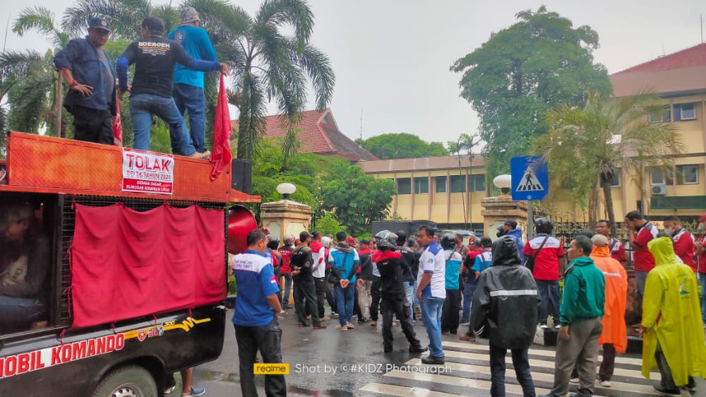 Sidoarjo, KPonline – Ditengah guyuran hujan siang ini, Rabu 16 November 2022 ,Kaum Buruh yang tergabung dalam Persatuan Pekerja Buruh Sidoarjo (PPBS) melakukan aksi demonstrasi di Kantor Bupati Sidoarjo.