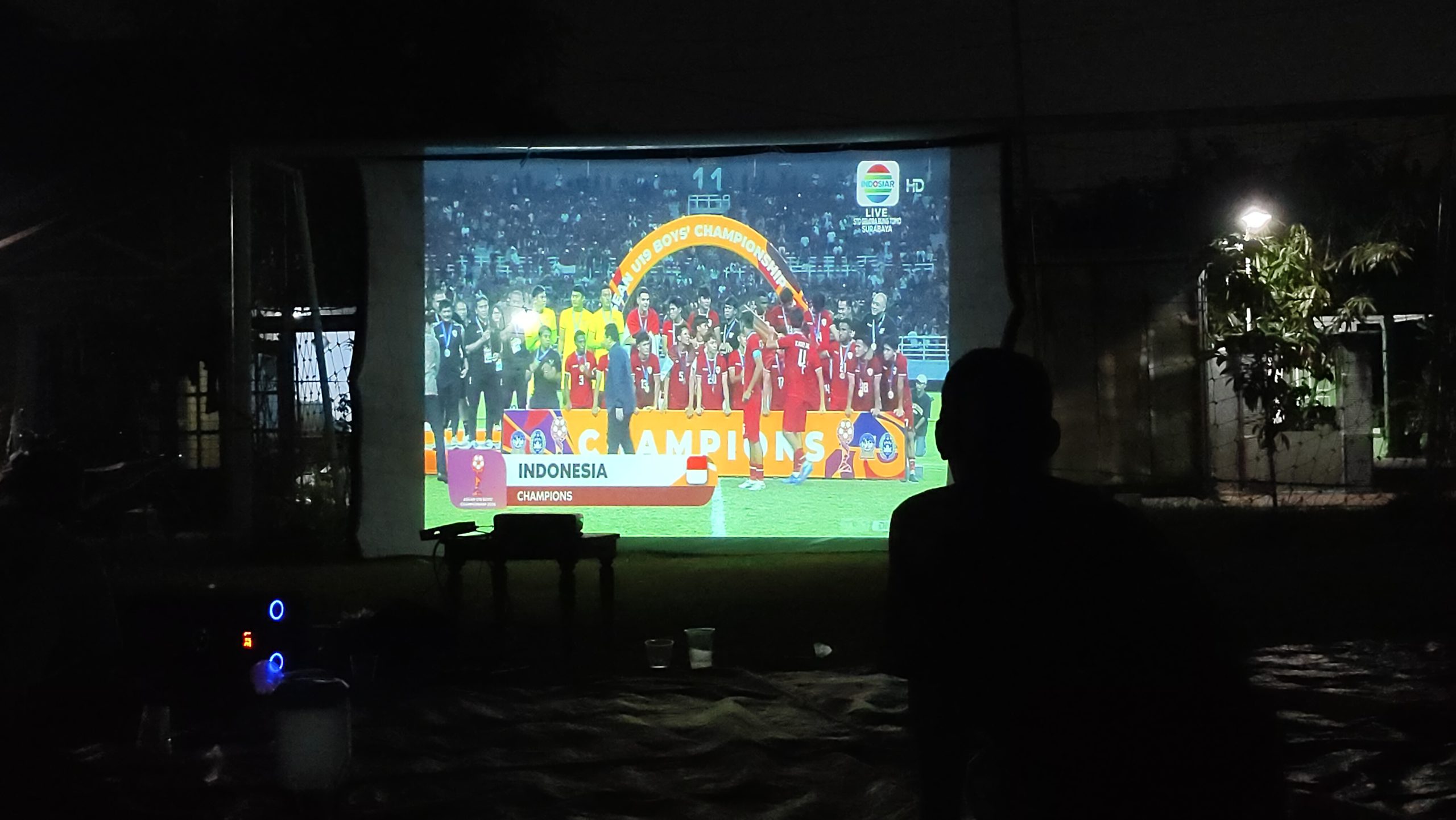 Pukul 18.00 WIB, Seniman bersama warga lain mulai memasang Layar putih di gawang lapangan tersebut. Begitu proyektor menyala, warga sekitar pun mulai berdatangan , meskipun mendadak ternyata animo warga sangat tinggi mulai dari anak anak, remaja, ibu ibu dan bapak bapak pun duduk di rumput beralaskan terpal.