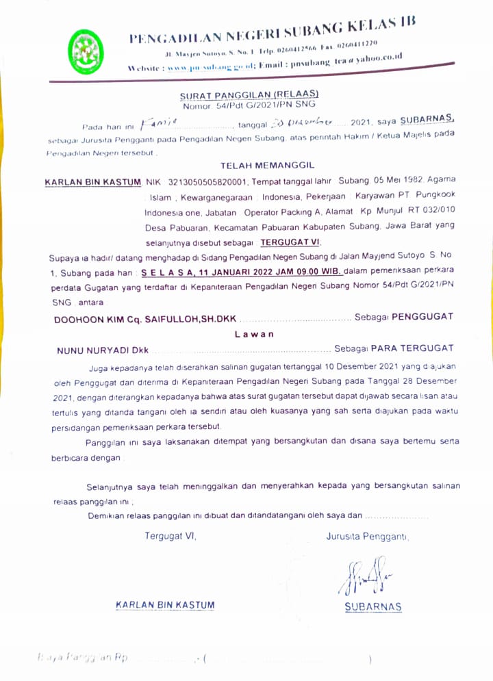 Adalah Doohaan Kim ,sang di rektur PT Pungkook Indonesia One yang berkewarganegaraan Korea Selatan dan beralamat di jl raya Puwodadi Blora KM 18 desa Tanjung rejo Wirosari Grobogan Jawa Tengah sebagai pihak yang menggugat, danTertulis dalam surat yang di terima PUK SPAI FSPMI PT Pungkook Indonesia One Surat panggilan (relaas), tertanggal 30 desember 2021, dan sebagai pihak tergugat Yaitu :