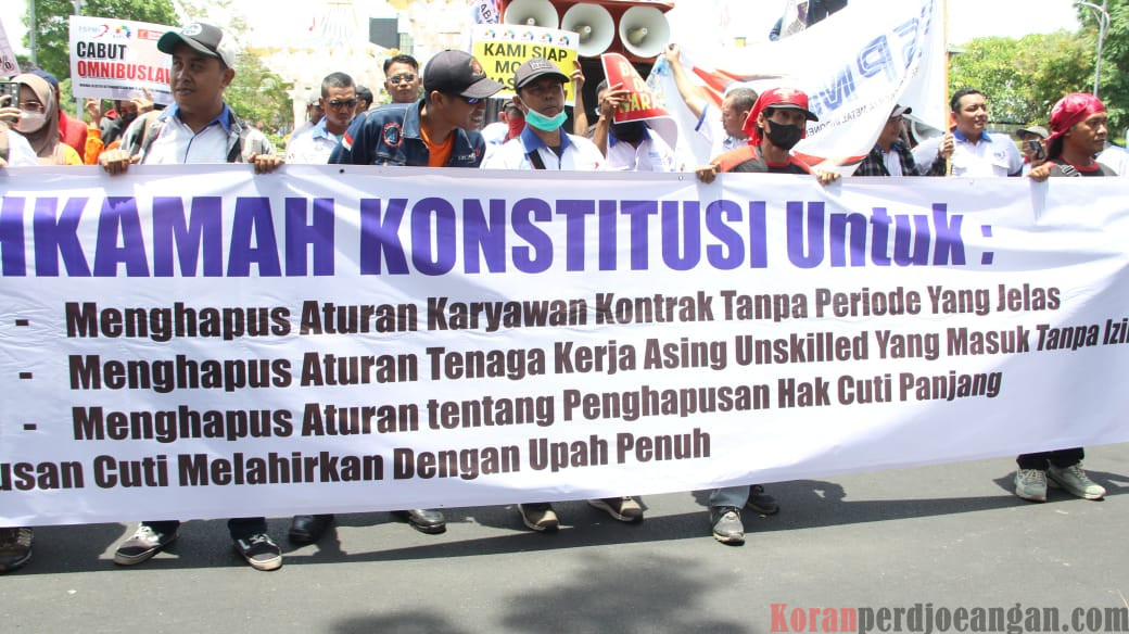 Surabaya, KPonline – Ratusan buruh yang tergabung dalam Konfederasi Serikat Pekerja Indonesia (KSPI) Jawa Timur berasal dari perwakilan daerah khususnya kawasan industri di Jawa Timur, diantaranya dari Kota Surabaya, Sidoarjo, Gresik, Mojokerto, Pasuruan, Tuban, Probolinggo, dan Jember kembali menggelar aksi terkait kenaikkan UMK 2025.