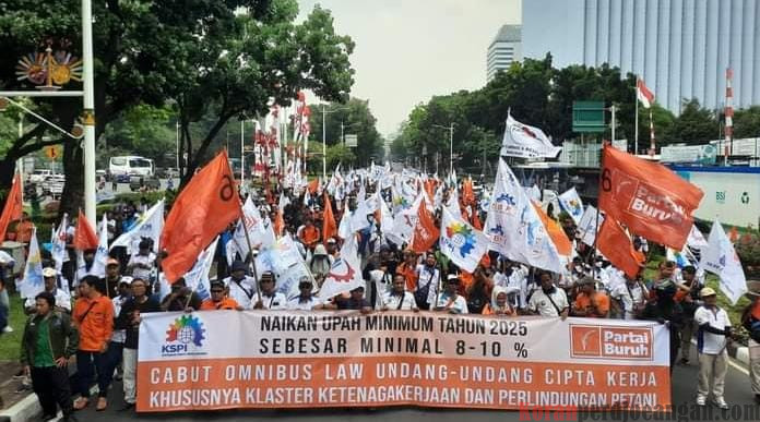 “Pertama, naikkan upah minimum 2025 sebesar 8%-10%, tanpa Peraturan Pemerintah (PP) Nomor 51 Tahun 2023. Kedua, cabut Omnibus Law UU Cipta Kerja setidak-tidaknya klaster ketenagakerjaan dan perlindungan petani.” ujar Winarso, ketua Perda KSPI DKI Jakarta.