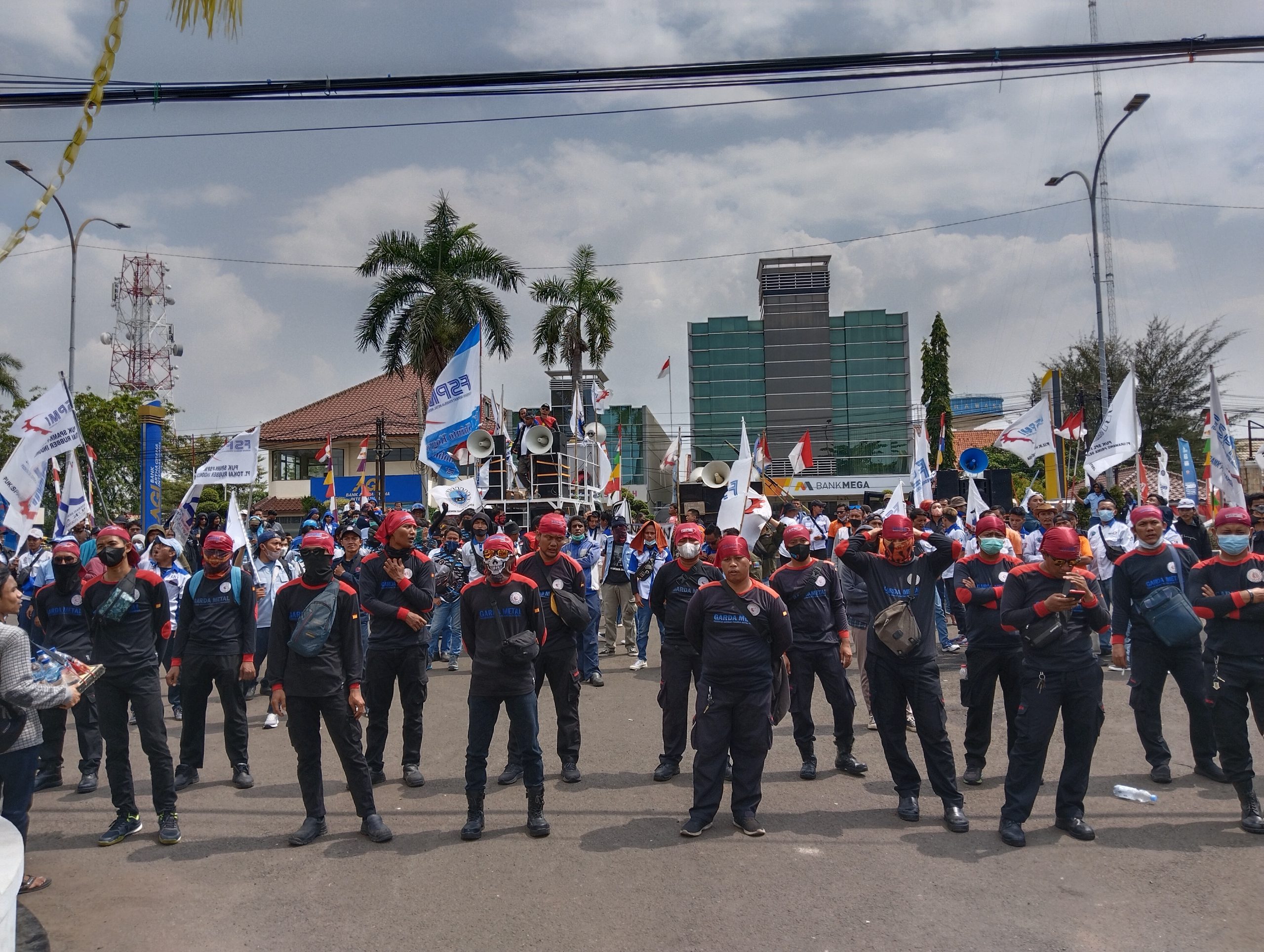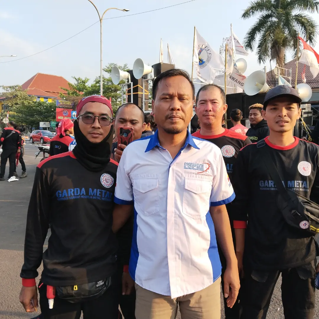 Terlihat ribuan massa aksi buruh Federasi Serikat Pekerja Metal Indonesia (FSPMI) Kabupaten Karawang yang telah di instruksikan kepada seluruh anggota 4 SPA FSPMI berbondong – bondong dari masing masing kawasan ke Pemda Karawang.