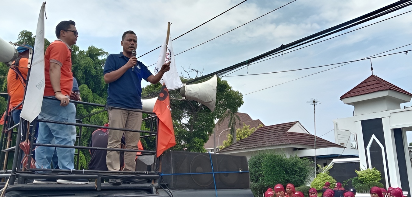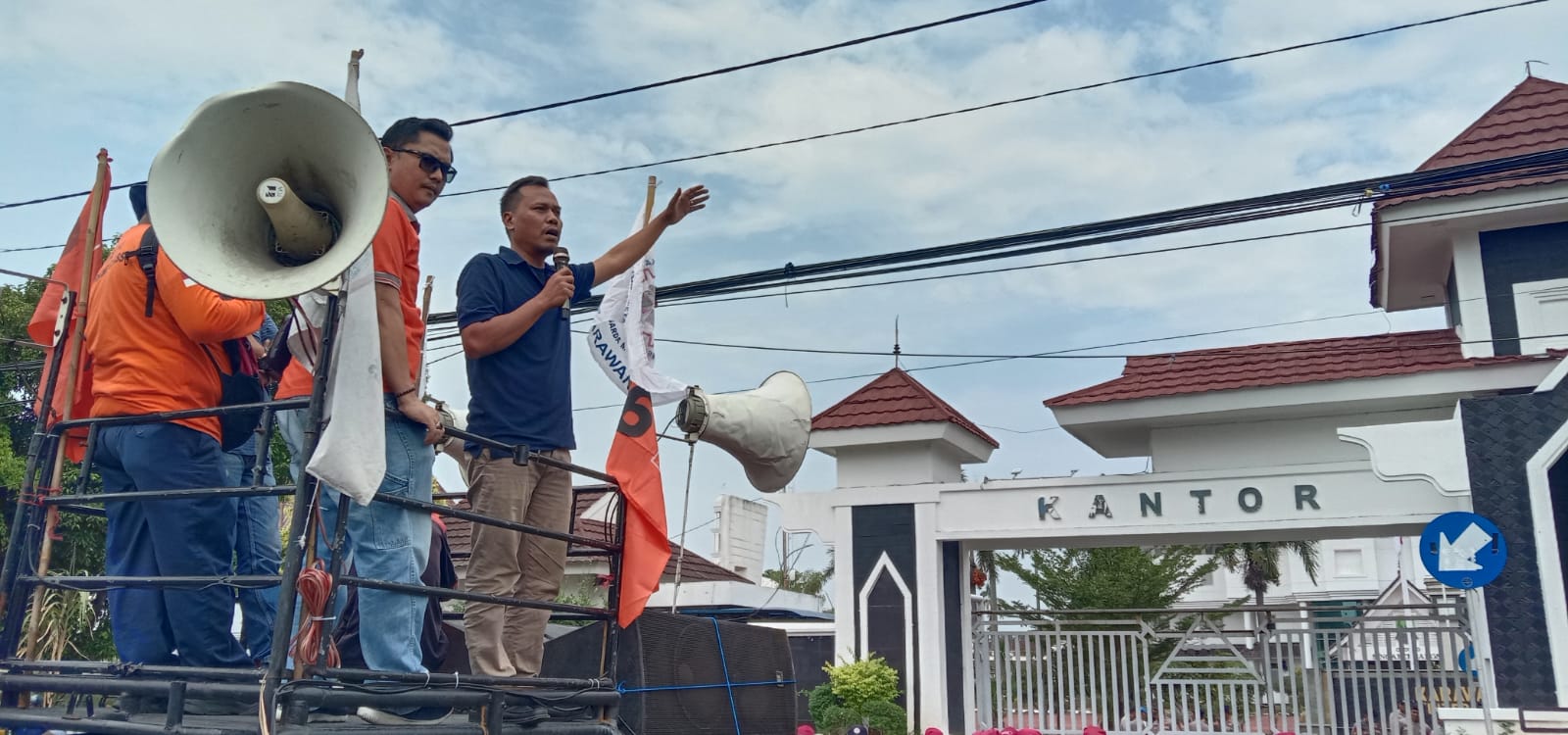 Di atas Mobil Komando Ketua KC FSPMI Kabupaten Karawang sekaligus Ketua PC SPAMK FSPMI Kabupaten Karawang dan juga Caleg DPRD Kabupaten Karawang Dapil 5 Nomor Urut 2 yaitu Asmat Serum, S.H dalam Orasinya menyampaikan dan menjelaskan yang berhubungan dengan Tuntutan kenaikan Upah Tahun 2024 sebesar 15 %.