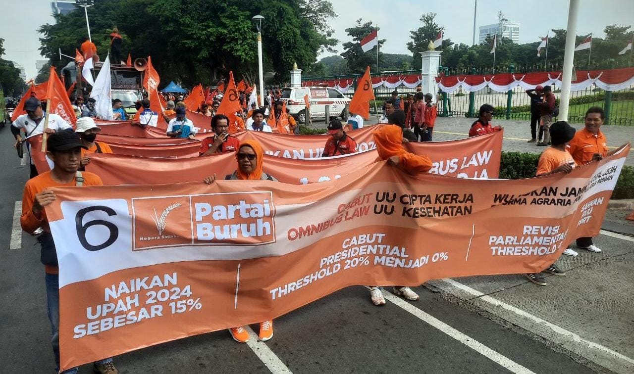 Yang pertama, cabut omnibus law UU Cipta Kerja, lalu kemudian meminta kepada gubernur di seluruh Indonesia membuat rekomendasi kenaikan upah 2024 sebesar 15 persen.