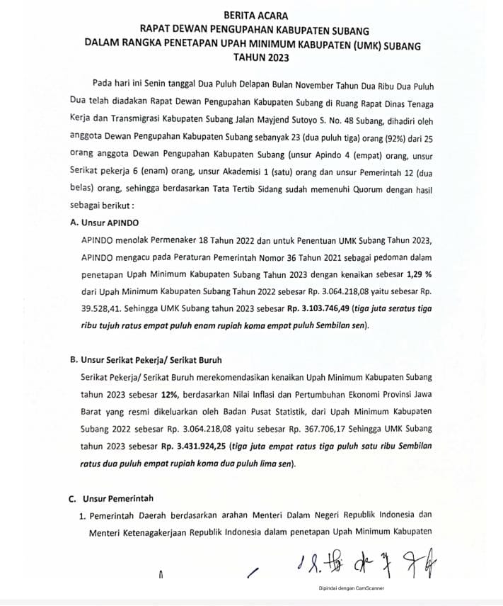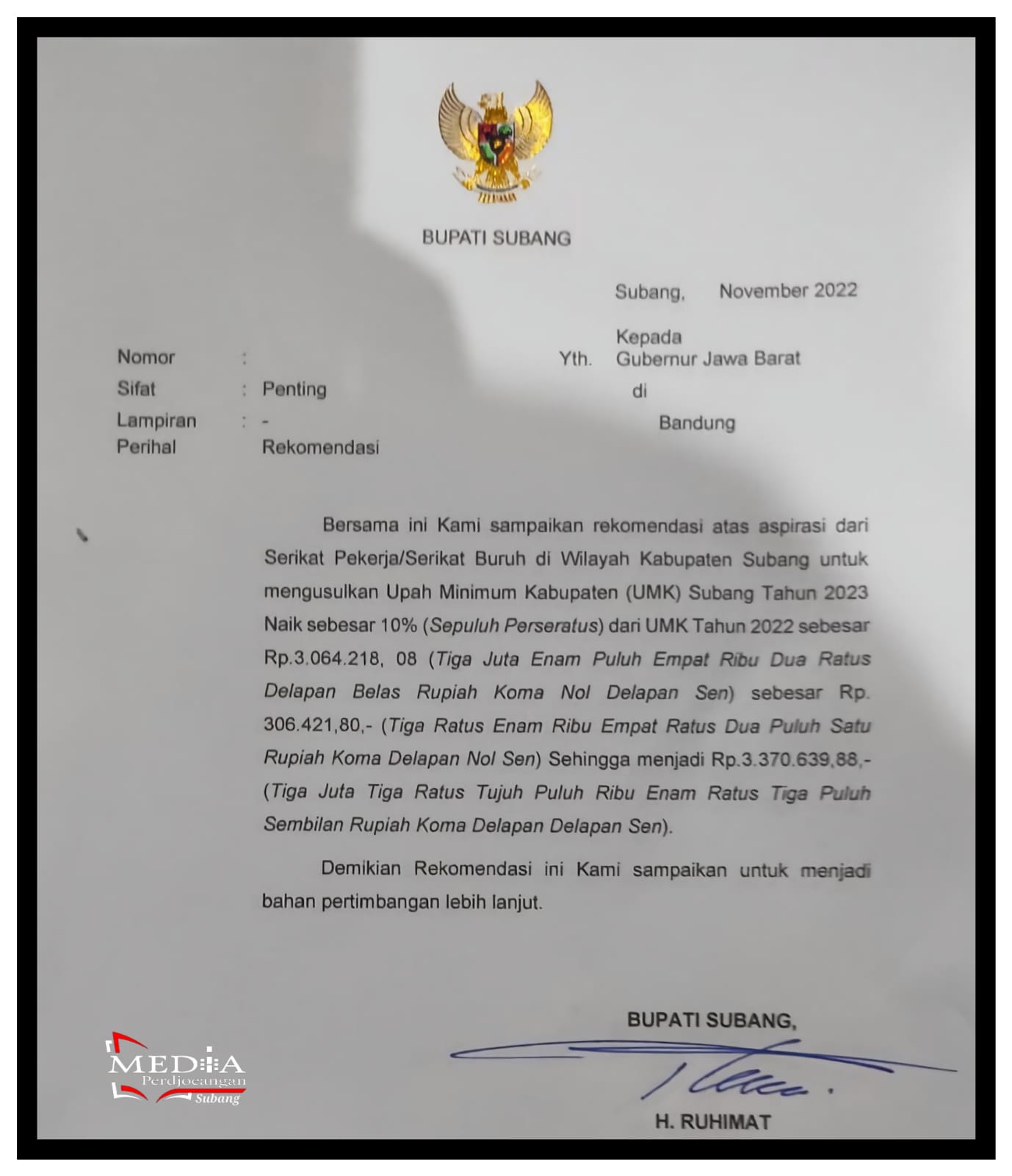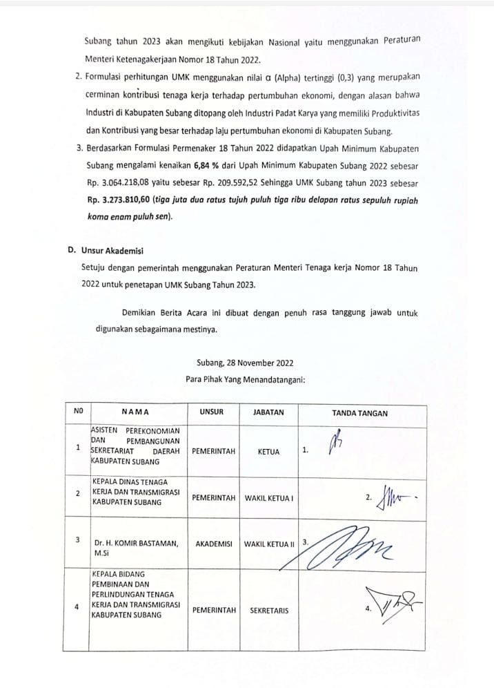 menyikapi keputusan Depekab Subang yang tidak bulat, atau tidak satu suara maka setelah bermusyawarah antar ketua serikat pekerja akhirnya di putuskan untuk menginformasikan hasil berita acara rapat Depekab kepada Bupati Subang sekaligus meminta kepada Bupati Subang untuk memberikan keputusan diskresi , dan akhirnya di putuskan oleh Bupati Subang untuk kenaikan UMK Kabupaten Subang Tahun 2023 naik sebesar 10 % atau senilai Rp. 306.218,80( tiga ratus enam ribu dua ratus koma delapan nol sen rupiah ).