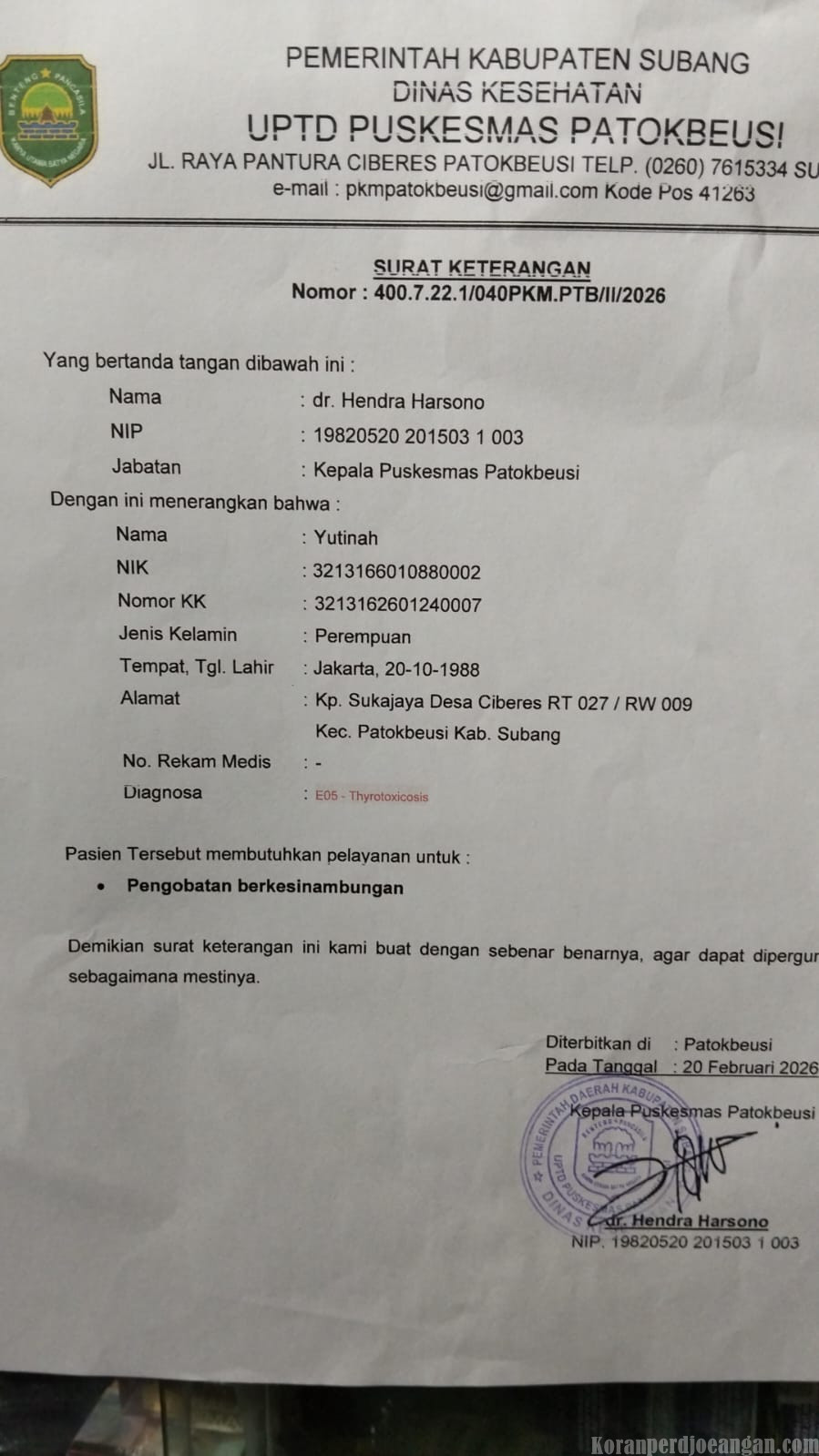 Pada 23 Februari 2026, Yutirah terpaksa menjalani pengobatan dengan biaya pribadi berkisar Rp800.000 hingga Rp1.000.000 akibat status kepesertaan yang tidak aktif. Beban itu jelas berat bagi keluarga dengan penghasilan tidak menentu.