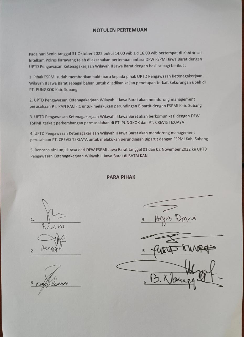 Di tegaskan dalan notulen tersebut bahwa pihak pengawas akan mendorong kepada PT Crevis TexJaya untuk melakukan perundingan Bipartit dengan FSPMI Kabupaten Subang langsung terkait permasalahan kekurangan upah tersebut. Di perkirakan satu pekan ke depan jawaban akan di selesaikan penyelesaian pelaporan dari PUK SPAI FSPMI PT CTJ dalam bentuk Nota khusus.