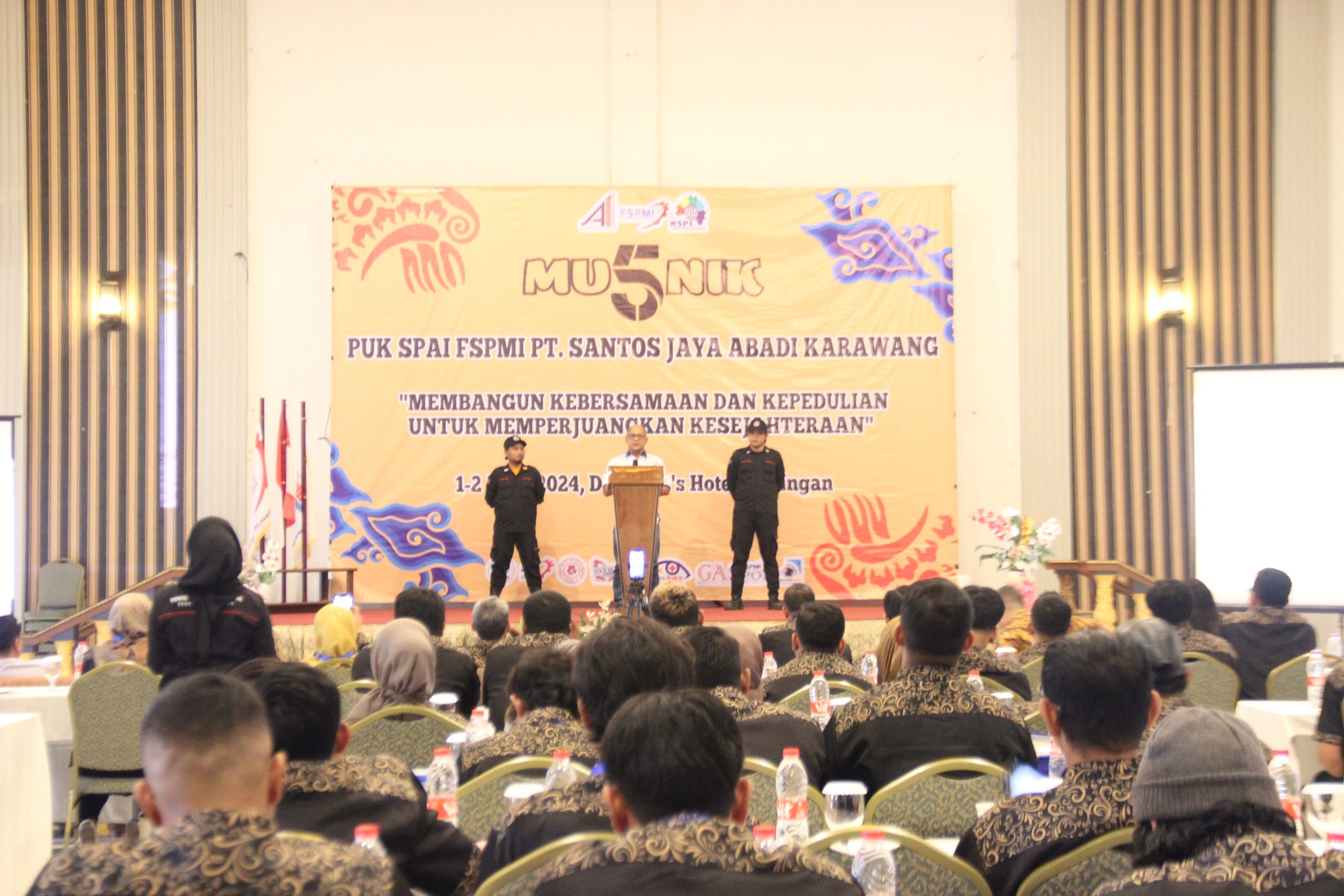 Di awali dengan menyanyikan lagu kebangsaan Indonesia Raya dan Mars FSPMI yang dilanjutkan dengan pembacaan Ayat Suci Al Qur’an dan Film Dokumenter dari Infokom PUK, yang kemudian dilanjutkan dengan sambutan – sambutan, Sambutan yang pertama dari Ketua Pelaksana Musnik V PUK SPAI FSPMI PT. Santos Jaya Abadi Pono Hartomo, S.T., Kemudian yang kedua sambutan dari Ketua PUK SPAI FSPMI PT. Santos Jaya Abadi Wawan Junianto, Management PT. Santos Jaya Abadi Bapak Hermawan Widi, Perwakilan Disnakertrans Karawang Ibu Friskawati,