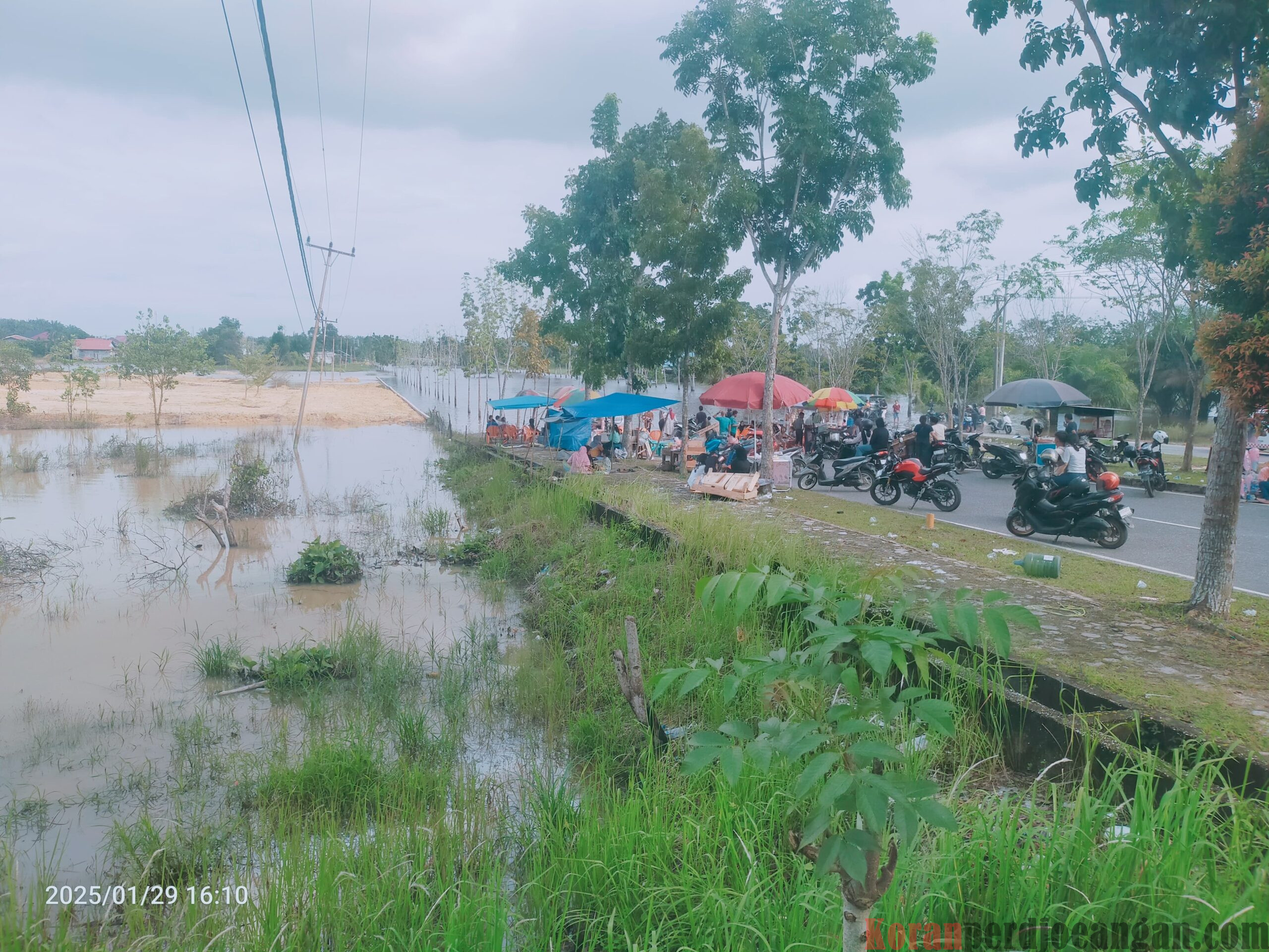Sejak siang hari, anak-anak terlihat berenang dan bermain air di lokasi banjir, sementara para orang tua mengawasi dari tepi jalan. Beberapa warga bahkan membawa ban bekas dan perahu kecil sebagai sarana bermain. Situasi ini menciptakan suasana layaknya objek wisata alami, meskipun sebenarnya genangan air ini terjadi akibat curah hujan tinggi yang mengguyur wilayah Pelalawan dalam beberapa hari terakhir.
