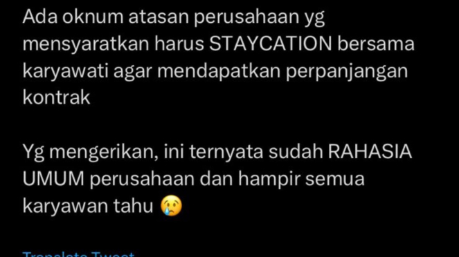 “Banyak yang up soal perpanjangan kontrak di perusahaan area Cik*rang. Ada oknum atasan perusahaan yang mensyaratkan harus STAYCATION bersama karyawati agar mendapatkan perpanjangan kontrak. Yang mengerikan, ini ternyata sudah RAHASIA UMUM perusahaan dan hampir semua karyawan tahu,” cuit @Miduk17, pada Minggu (30/4/2023).