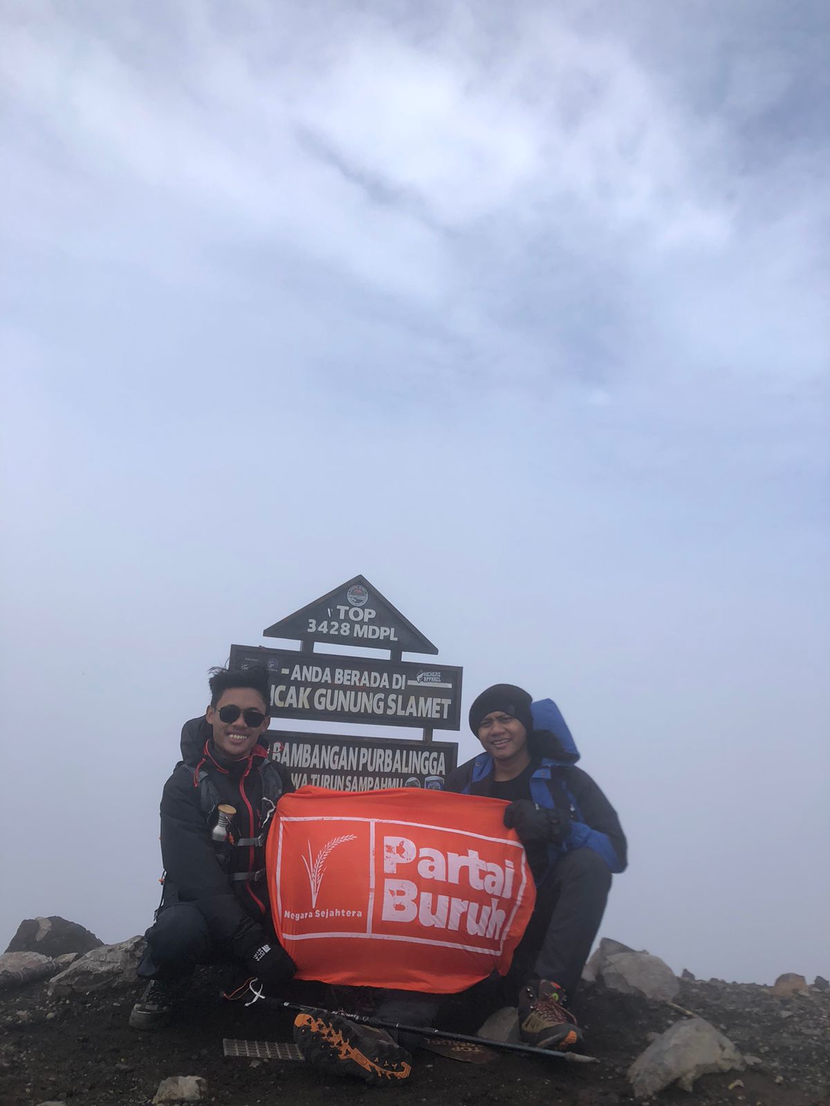 Bendera FSPMI dan bendera Partai Buruh berhasil dikibarkan di puncak gunung Slamet Jawa Tengah dengan ketinggian 3.428 MDPL.