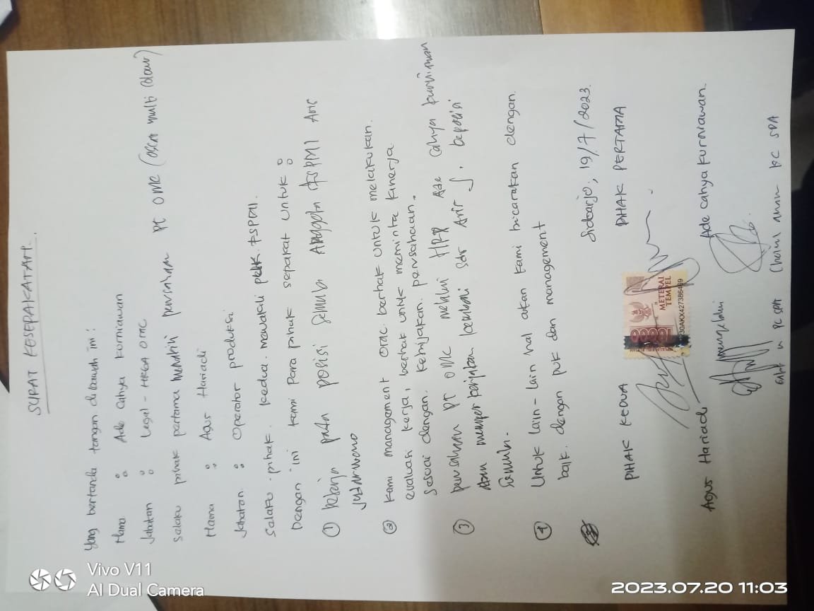 Aris akhirnya dipekerjakan kembali ,hal ini tertuang di dalam kesepakatan yang di bubuhi tanda tangan diatas Materai.
