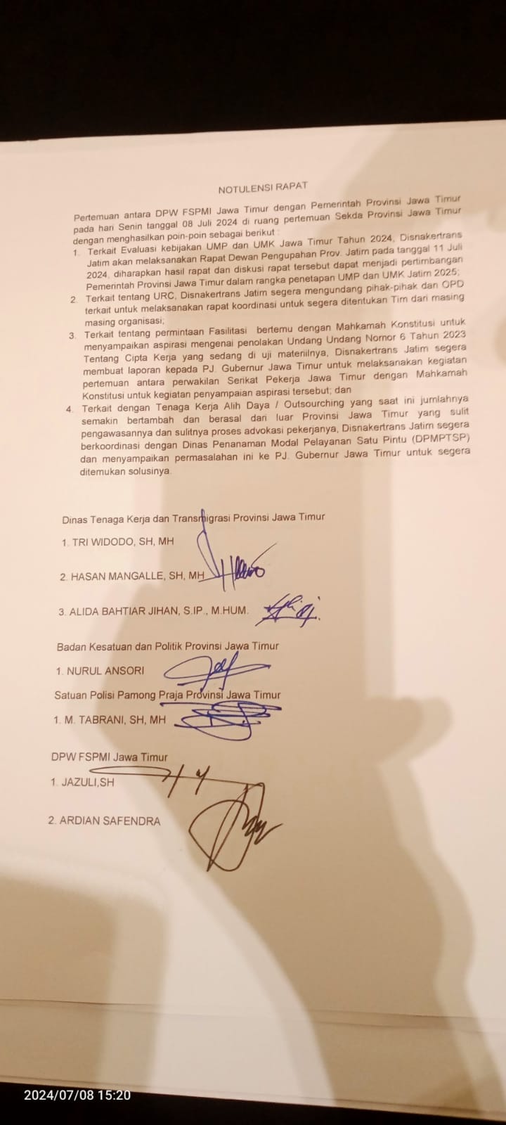 Pertemuan antara DPW FSPMI Jawa Timur dengan Pemerintah Provinsi Jawa Timur pada hari Senin tanggal 08 Juli 2024 di ruang pertemuan Sekda Provinsi Jawa Timur dengan menghasilkan poin-poin sebagai berikut :