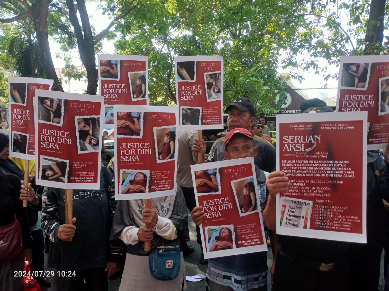 Aksi demo di Pengadilan Negeri Surabaya digelar sebagai bentuk protes terhadap putusan hakim yang memvonis bebas Ronald Tannur, terdakwa penganiaya Dini Sera Afrianti hingga meninggal dunia. Massa aksi yang tergabung dalam Tim Advokasi Buruh Peduli Anak Negeri (TABUR PARI) YLBHI LBH Surabaya, LBH Buruh dan Rakyat Jawa Timur, LBH FSPMI Jawa Timur, LBH FSP-KEP Gresik, Biro Bantuan Hukum Damar Indonesia, dan LBH SKOBAR, menyuarakan ketidakpuasan mereka terhadap keputusan tersebut.