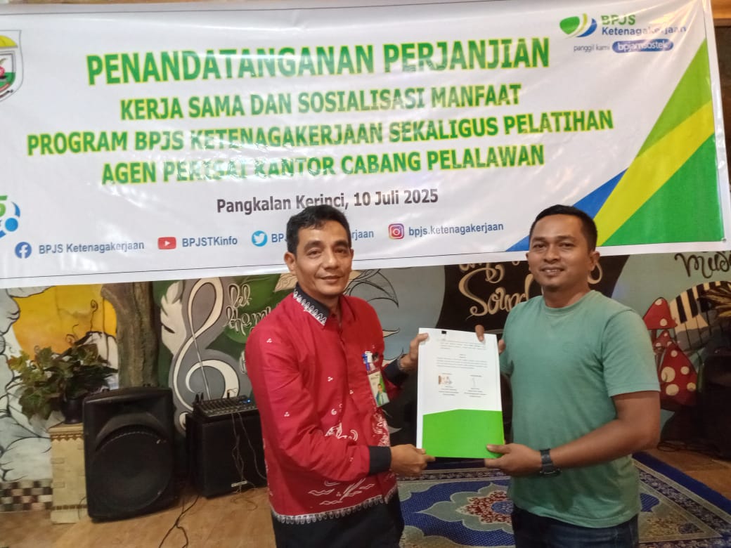Pelalawan, KPonline — Dalam upaya memperkuat jaminan sosial ketenagakerjaan bagi masyarakat pekerja, FSPMI Riau bersama BPJS Ketenagakerjaan Kantor Cabang Pelalawan resmi menandatangani perjanjian kerja sama serta menggelar sosialisasi manfaat program BPJS Ketenagakerjaan sekaligus pelatihan Agen Perisai. Kegiatan tersebut berlangsung pada Kamis, (10/7/2025) di Kampung Kopi Coffee, Desa Makmur SP.6, Kecamatan Pangkalan Kerinci, Kabupaten Pelalawan.