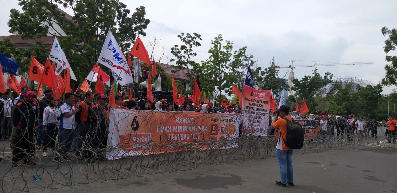 Batam, KPonline- Ratusan buruh Batam yang tergabung dalam koalisi rakyat Batam, hari ini selasa (14/11/2023) turun aksi, menuntut walikota Batam untuk menaikan UMK 2024 Batam 15%, atau sekitar Rp 675,066.