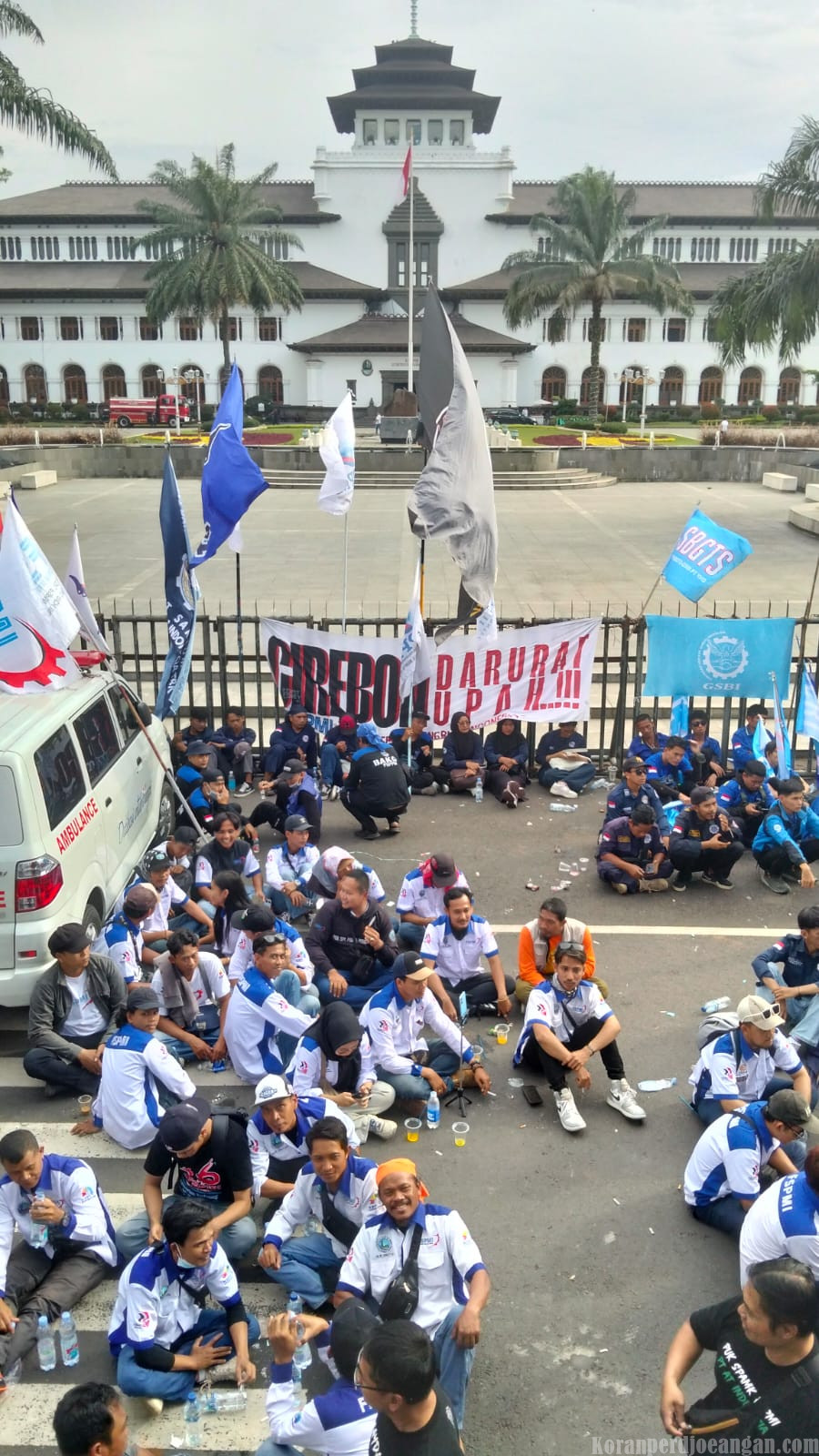 Ribuan buruh dari berbagai aliansi dan serikat pekerja di Jawa Barat turun ke jalan dan memadati kawasan Jalan Diponegoro hingga depan Gerbang Gedung Sate, Bandung. Puluhan mobil komando dari masing-masing SP/SB turut menguasai ruas jalan, menyebabkan kepadatan lalu lintas di sekitar lokasi aksi.