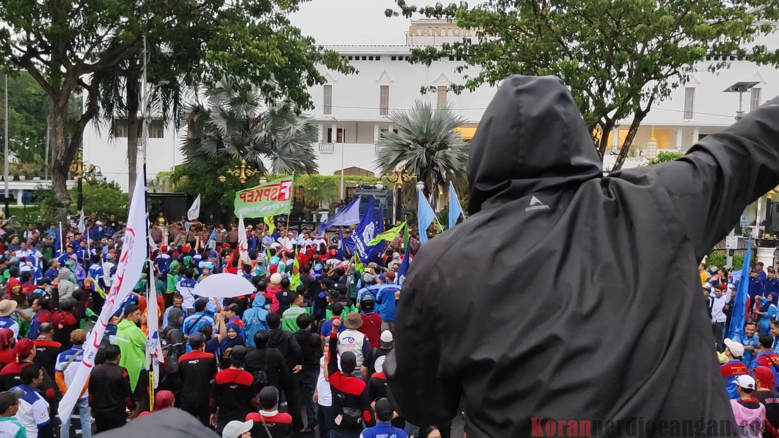Surabaya, KPonline – 17 Desember 2024, Meski diguyur hujan, semangat perjuangan para buruh Jawa Timur tetap membara. Meskipun hujan turun lebih dari 20 unit mobil komando (MOKOM) dan ribuan buruh masih bertahan mengawal proses penetapan Upah Minimum Kabupaten/Kota (UMK) dan Upah Minimum Sektoral Kabupaten/Kota (UMSK) di depan Kantor Gubernur Jawa Timur, Jl. Pahlawan, No. 110 Surabaya. Aksi tersebut dimulai sejak Selasa sore pukul 15.00 WIB.