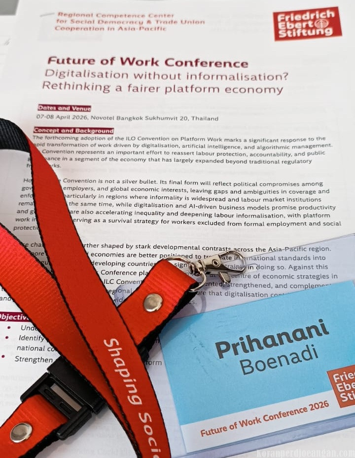 Bangkok, KPonline – Konferensi Future of Work yang digelar pada 7–8 April di Novotel Bangkok Sukhumvit 20 menempatkan isu pekerjaan platform digital sebagai fokus utama pembahasan di kawasan Asia-Pasifik. Forum ini mempertemukan serikat pekerja, pembuat kebijakan, dan para pakar untuk mengupas dampak digitalisasi, kecerdasan buatan (AI), serta arah regulasi global yang tengah dirumuskan melalui Konvensi International Labour Organization.