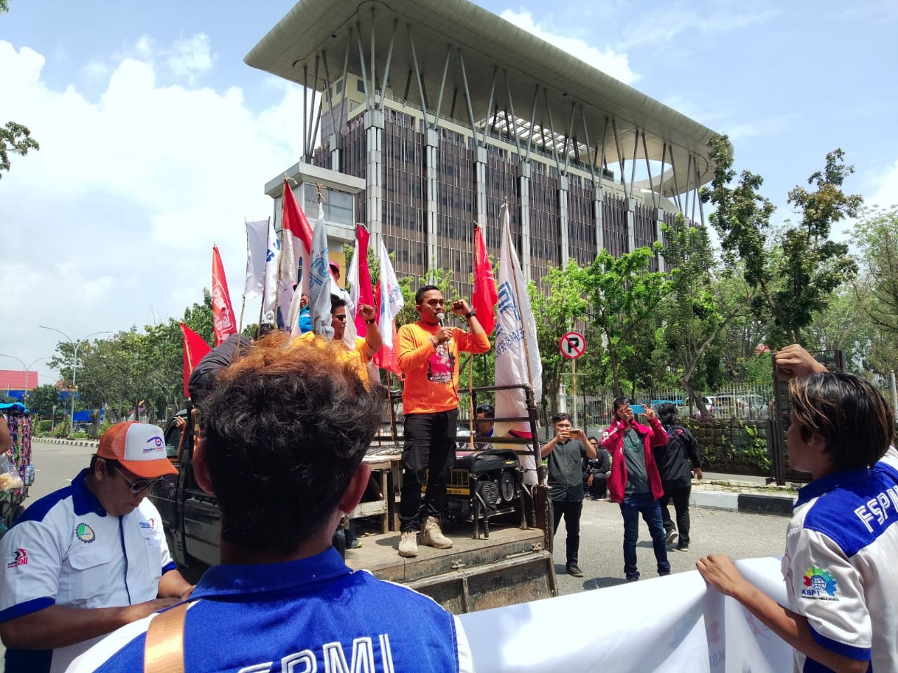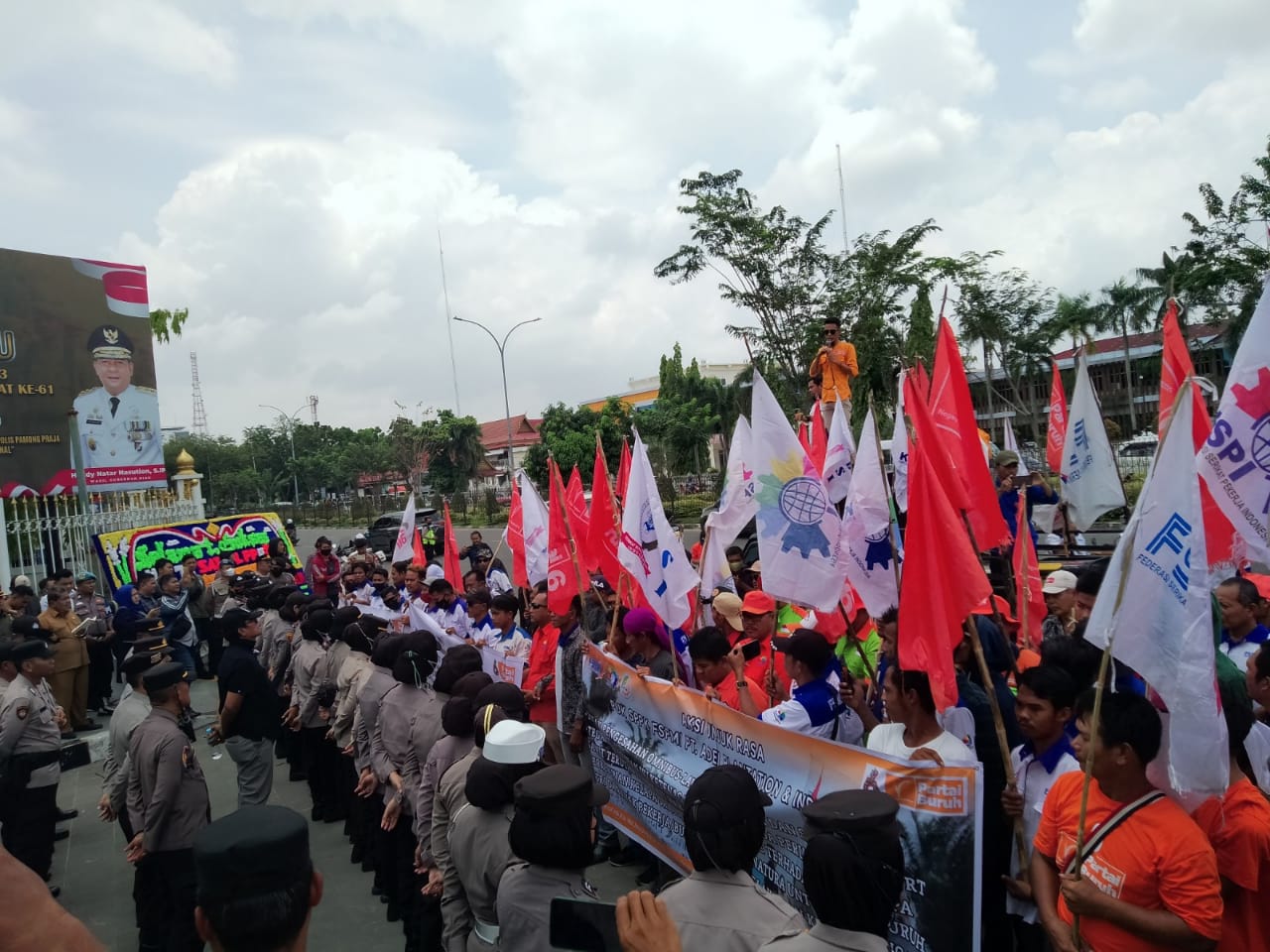 Riau, KPonline – Ratusan massa dari Federasi Sarikat Pekerja Metal Indonesia (FSPMI), Partai Buruh, dan serikat pekerja lainnya yang tergabung dalam KSPI melakukan aksi unjuk rasa menolak disahkannya RUU Cipta Kerja (Omnibuslaw) didepan Kantor Gubernur Riau, Jalan Jenderal Sudirman nomor. 460 Jadi Rejo, Sukajadi Kota Pekanbaru Riau, pada Selasa (14/03/2023).