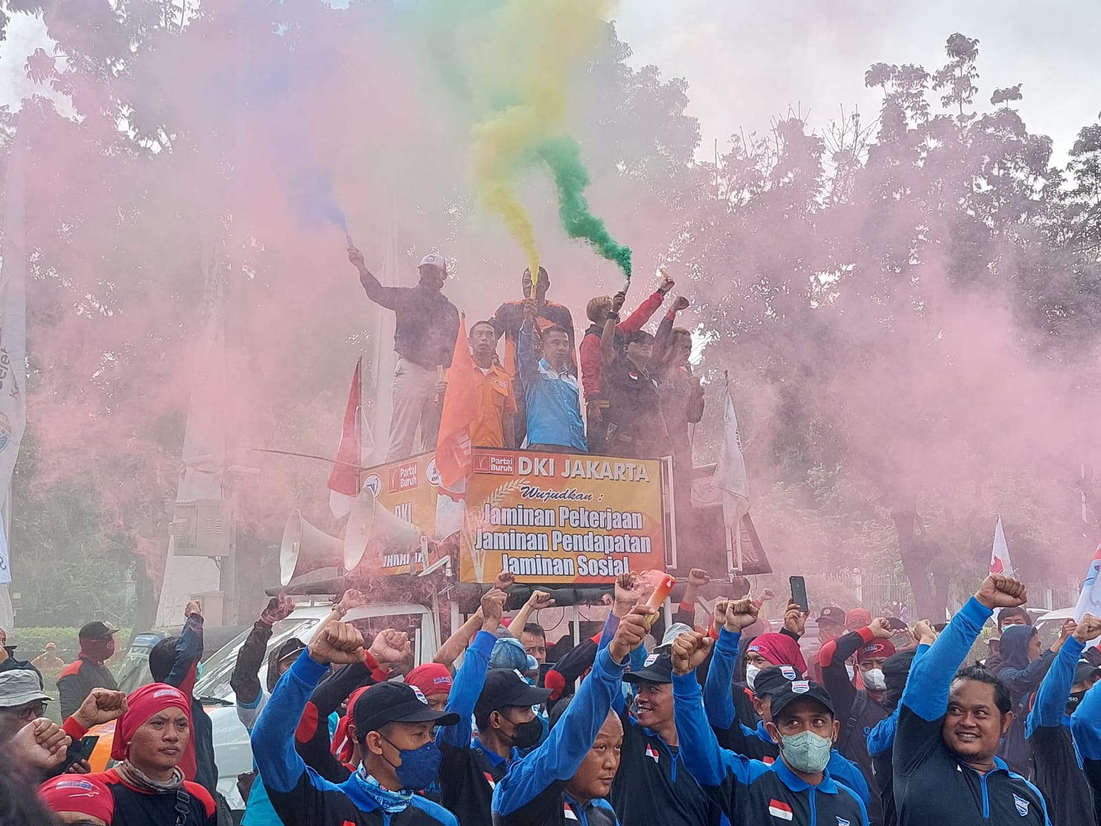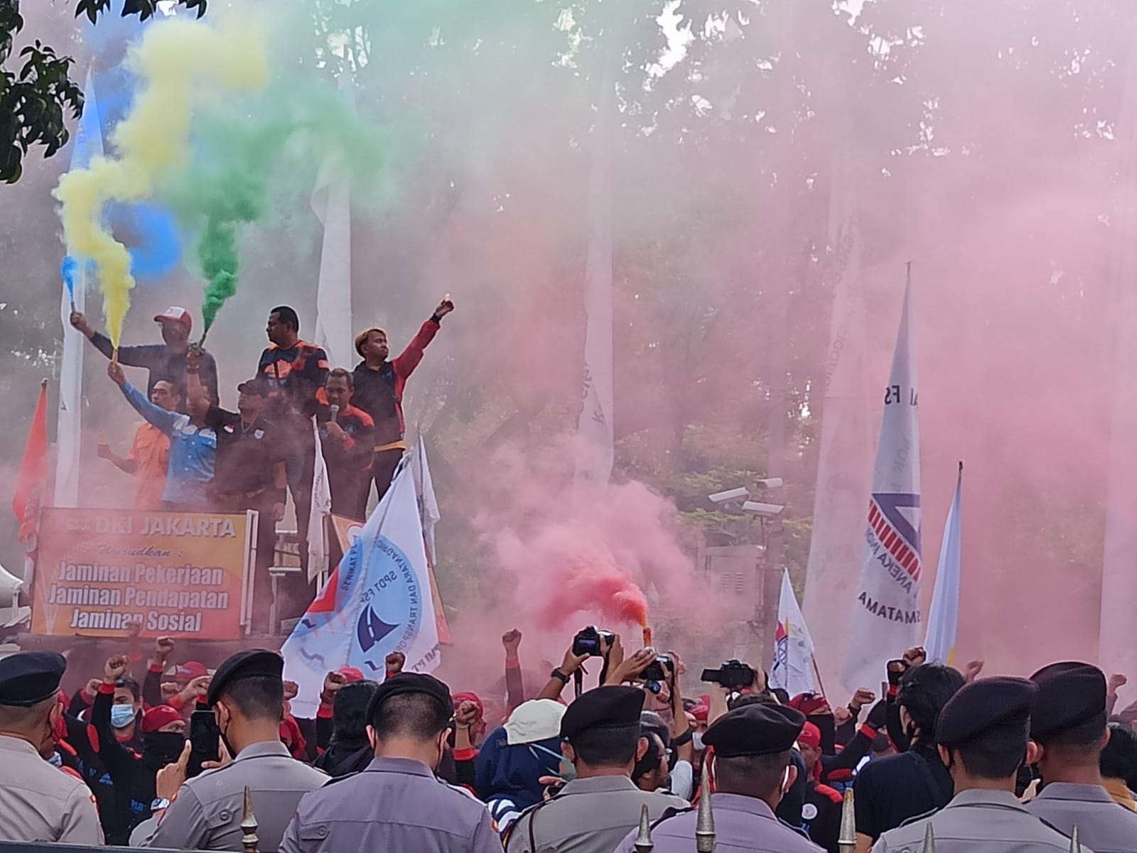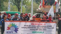 Jakarta, KPonline – Ratusan buruh yang tergabung dalam Konferensi Serikat Pekerja Indonesia (KSPI) mendatangi dan melakukan aksi unjuk rasa di Balai Kota DKI Jakarta, Rabu, 20 Juli 2022. Kedatangan para buruh itu untuk mendukung Gubernur DKI Jakarta Anies Baswedan mengajukan banding atas keputusan Pengadilan Tata Usaha Negara (PTUN) yang membatalkan kenaikan Upah Minimum Provinsi (UMP) Jakarta tahun 2022.