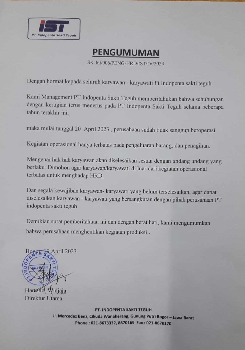 “Besar harapan dari seluruh Karyawan agar mereka masih dapat tetap bekerja dan kalaupun hal ini harus terjadi besar pesangon tidak lah menggunakan UU cipa kerja PP 35 d karenakan pengabdian pada perusahann tersebut rentang waktu yang tidak sedikit. Ada yg sudah mengabdi 10-15 tahun dan bahkan sejak perusahan mulai produksi pun kurang lebih pengabdian 25 tahunan “. Gunawan)
