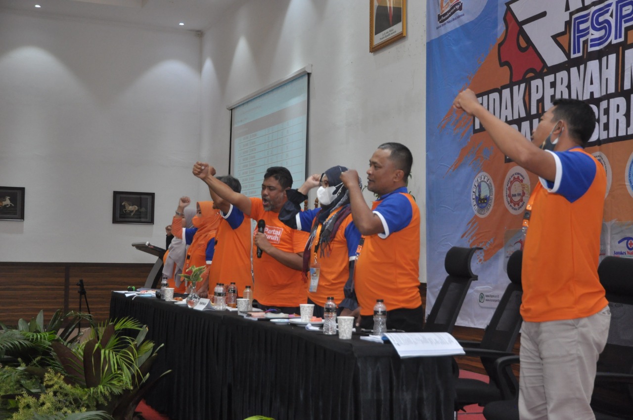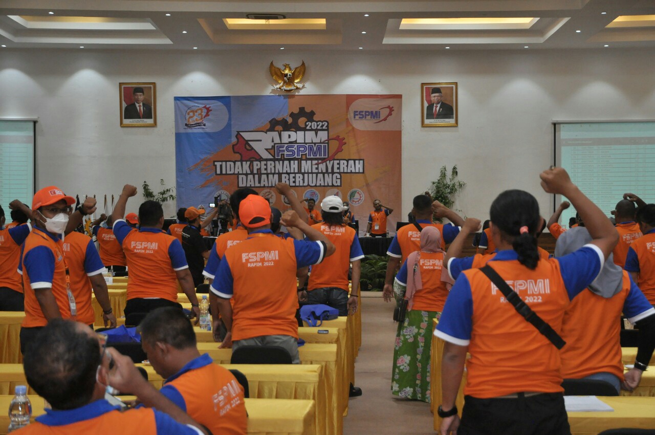 Bogor, KPonline – Semangat dan Yel yel FSPMI maupun Yel yel Partai buruh bergemuruh, suara dan teriakan terdengar serempak yang berasal di Ball Room Hotel Chevilly Resort & Camp Ciawi Bogor di Rapat Pimpinan Nasional (Rapimnas) FSPMI. Rabu, (9/2/22).