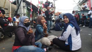 (Tanpa kue ultah tetap semangat Lia (berseragam putih) merayakan ulang tahunnya dengan hadir di tengah-tengah aksi perjuangan rekan-rekan pekerja Indomarco Sidoarjo)