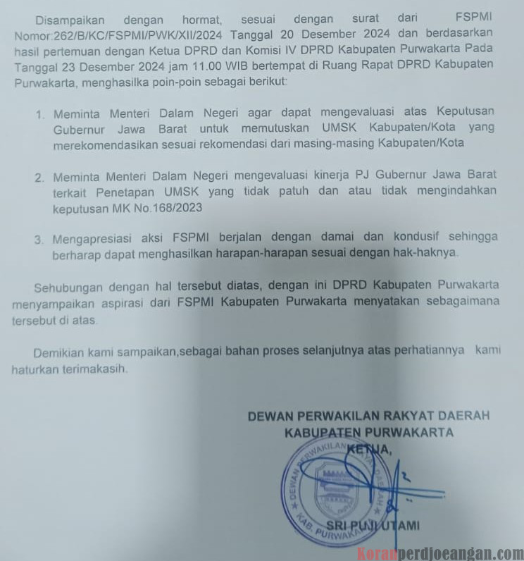 Dalam audiensi yang berlangsung di ruang pertemuan DPRD Purwakarta, Ketua Pimpinan Cabang Serikat Pekerja Automotif Mesin dan Komponen (PC SPAMK-FSPMI) Purwakarta, Wahyu Hidayat, menyampaikan aspirasi para buruh. Pertemuan ini menghasilkan beberapa poin penting yang dituangkan dalam surat bernomor 400.14.6/1058/DPRD dan ditandatangani oleh Ketua DPRD Purwakarta, Sri Puji Utami.