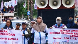 Surabaya, KPonline — Sebagai bagian dari peringatan HUT ke-26, FSPMI Jawa Timur menggelar aksi demonstrasi di depan Hotel Tunjungan, Surabaya (6/2/2025) sebelum melanjutkan aksi ke Kantor Gubernur Jawa Timur. Eka Hernawati, S.H., M.H., Ketua Bidang Pemberdayaan Perempuan dan Pekerja Muda Pimpinan Pusat Aneka Industri (PPAI) FSPMI, menyuarakan dukungannya untuk 47 buruh hotel yang menjadi korban PHK sepihak, termasuk seorang buruh perempuan yang tengah hamil tua.