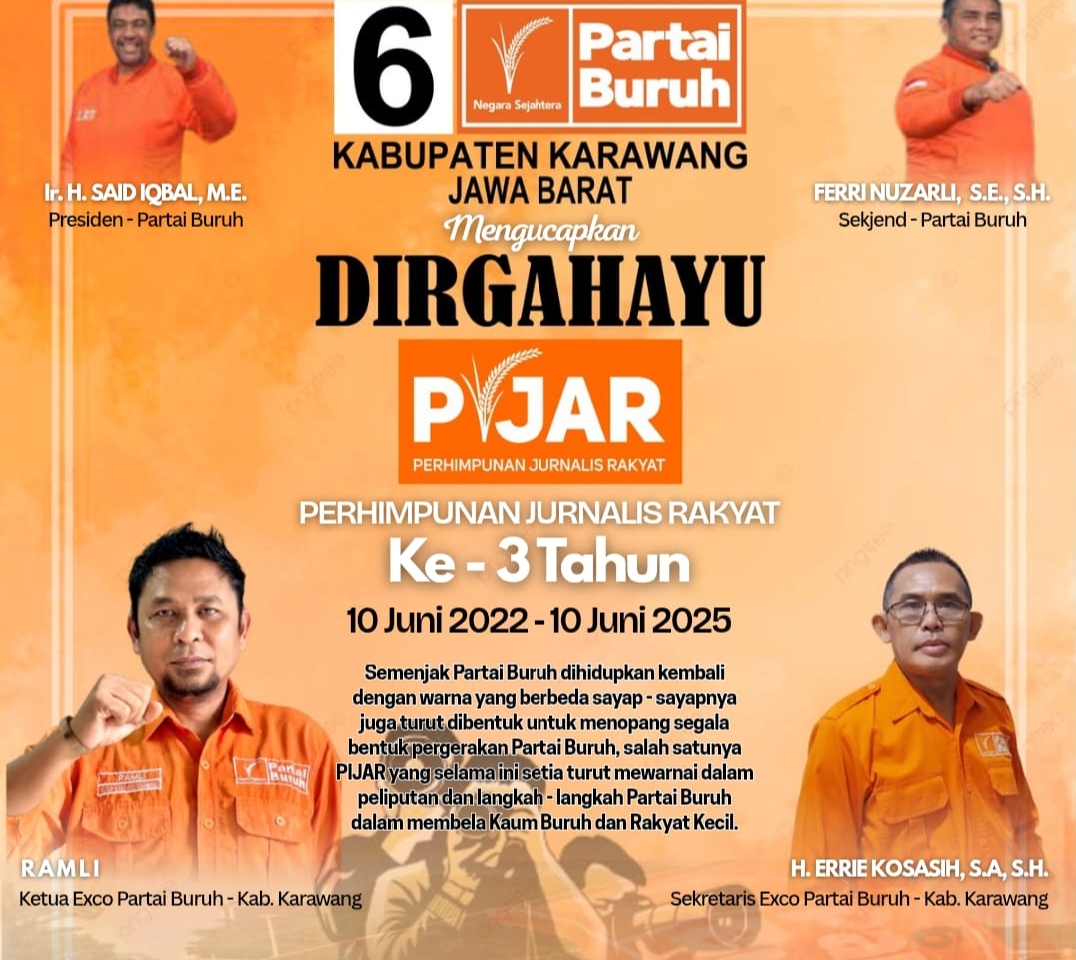 Karawang, KPonline – Executive Comitte (Exco) Partai Buruh Kabupaten Karawang mengucapkan Dirgahayu yang ke 3 Tahun kepada Perhimpunan Jurnalis Rakyat (Pijar) Partai Buruh, sebagai salah penopang segala bentuk pergerakan partai Buruh yang di Pusat sampai ke daerah di seluruh Indonesia dalam memperjuangkan langkah langkah partai Buruh membela kaum Buruh dan rakyat kecil. Selasa (10/6/25).