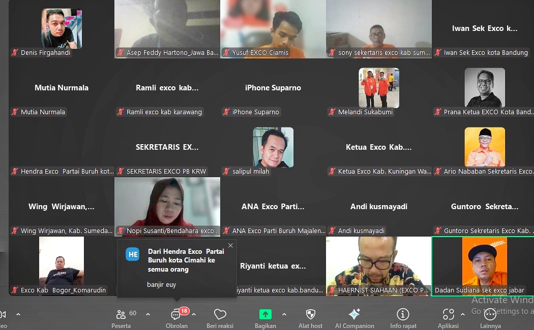 Bandung, KPonline – Executive Comitte (Exco) Partai Buruh Provinsi Jawa Barat menggelar Rapat Kerja Daerah (Rakerda) Pra Musda Exco Partai Buruh Provinsi Jawa Barat melalui Online (daring) Zoom Meeting pada Rabu malam (2/7/25).