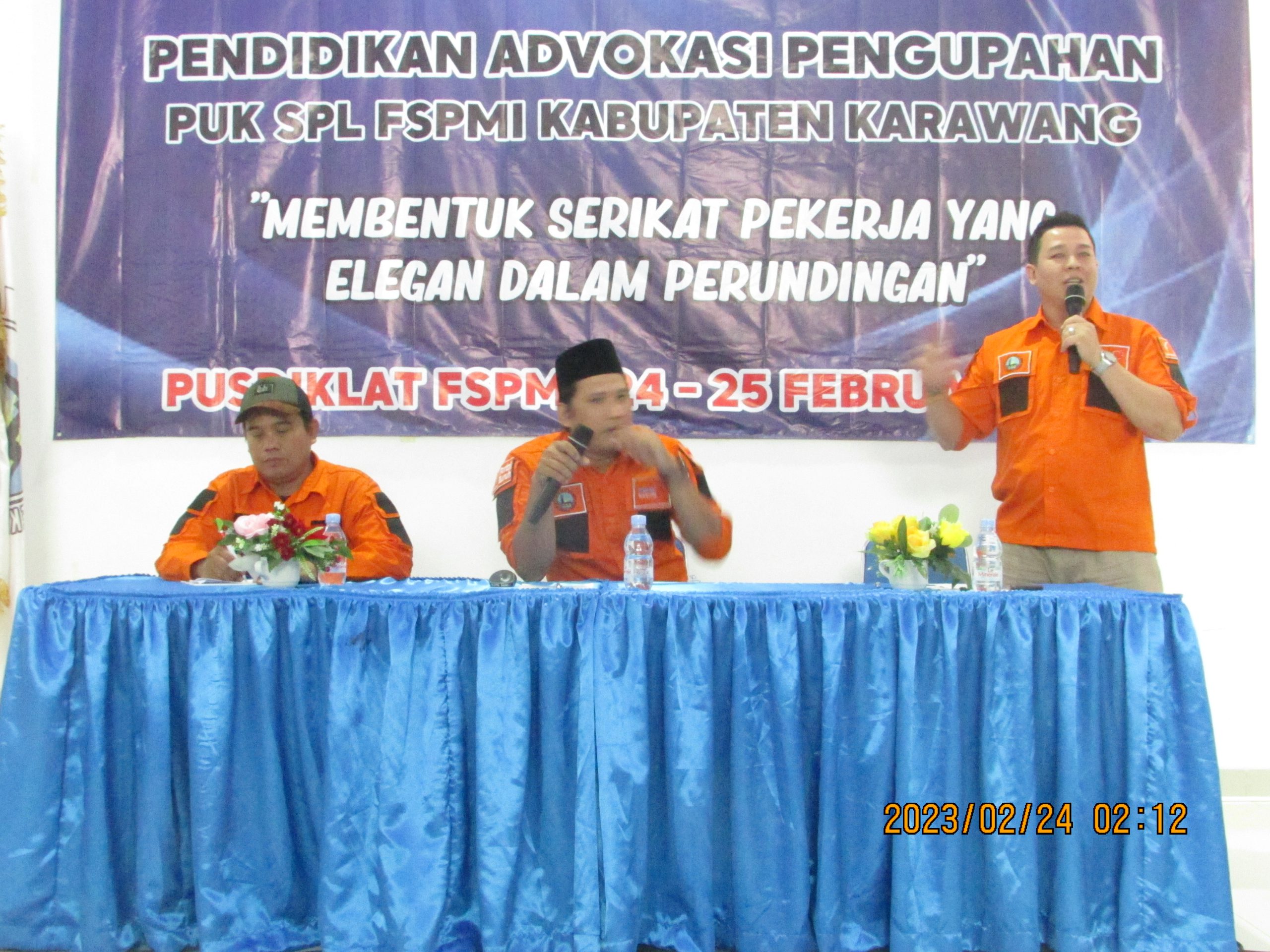 Pendidikan Advokasi dan Pengupahan ini dilaksanakan selama dua hari dari Tanggal 24 Februari 2023 sampai dengan 25 Februari 2023 dengan tema “Membentuk serikat pekerja yang elegan dalam Perundingan”, Yang di buka oleh Fadjar Setiawan sebagai MC sekaligus Panitia Pendidikan Advokasi dan Pengupahan ini. Sedangkan Sebagai pemberi materi Pendidikan Advokasi ini dari Pengurus PC SPL FSPMI Kabupaten Karawang Bidang II Husaeri, S.H dan Rengga Pria Hutama, S.H sedangkan untuk Pemateri Pengupahan dari Bidang III Muhamad Sulthon dan Ahmad Nurdih, S.H dan juga di hadiri langsung oleh Ketua PC SPL FSPMI Kabupaten Karawang Dedi Heryadi beserta jajarannya.