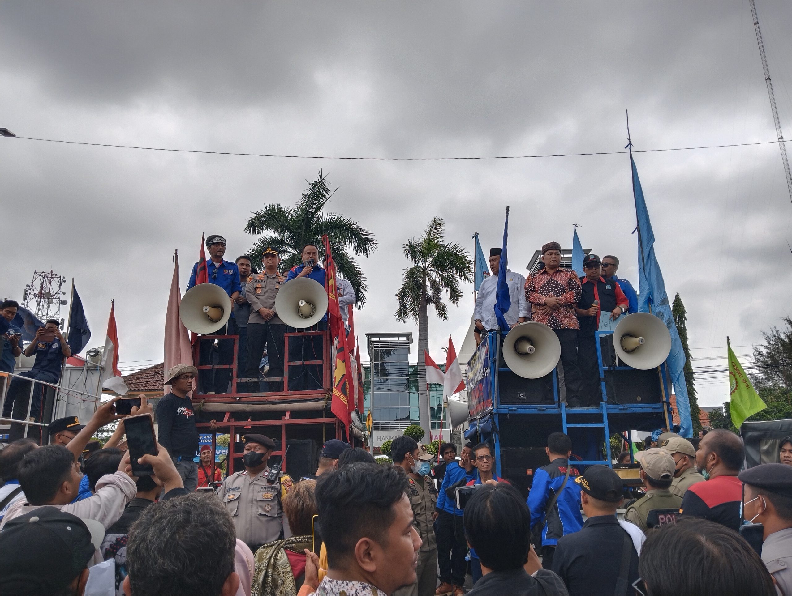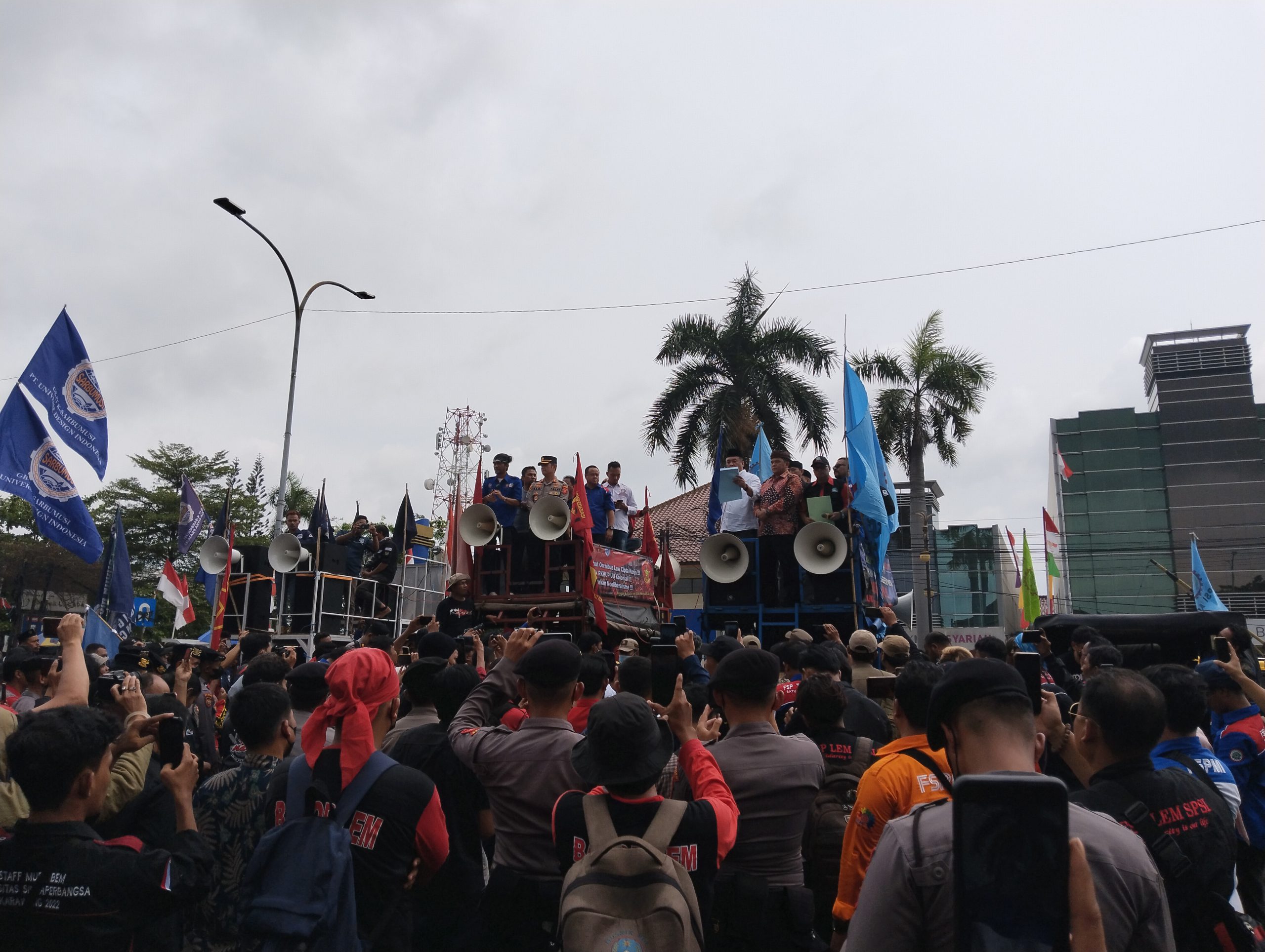 “FSPMI bersama Koalisi buruh pangkal (KBPP), ada FSP KEP SPSI, FSP LEM SPSI, FSP TSK SPSI, FSP RTMM, FSPEK KASBI dan FSP SARBUMUSI. Perjuangan hari ini mengadakan aksi ini dengan total masa aksi ada 1.000 orang. Kami unjuk rasa ke pemda karawang dan DPRD Karawang menuntut tiga yaitu Tolak kenaikan harga bahan bakar minyak (BBM), Tolak Omnibus Law – UU Cipta Kerja dan Naikan Upah Tahun 2023 sebesar 10% hingga 13% dan Alhamdulillah kami perwakilan dari KBPP sudah di terima untuk audiensi dengan Ketua DPRD Kabupaten Karawang Pendi Anwar, S.E & Setda Kabupaten Karawang Drs. Acep Jamhuri, M.Si dan mereka setuju membuat dan memberikan rekomendasi kepada pemeritah pusat yaitu Presiden Jokowi dan FSPMI sendiri akan kembali aksi pada hari rabu tanggal 14 September 2022 nanti”, jelasnya Asmat Serum, S.H