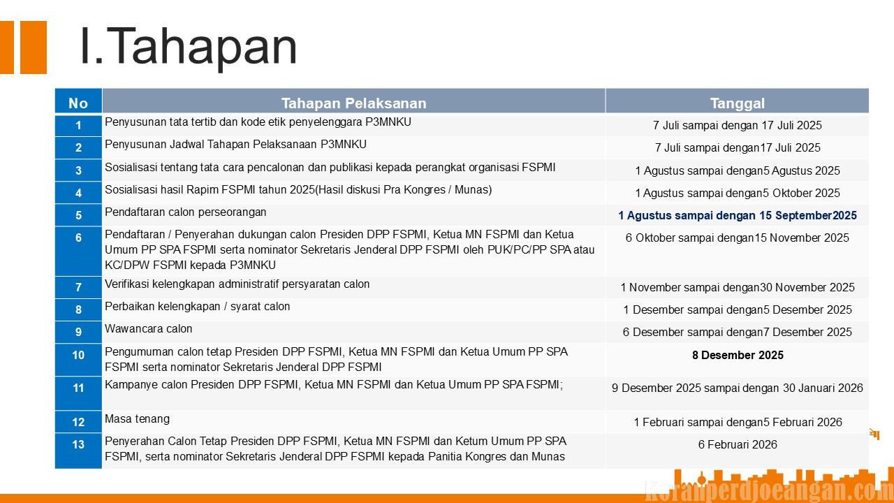 Selanjutnya, Sekretaris Panitia Pelaksana Pemilihan Presiden, Ketua Majelis Nasional, dan Ketua Umum PP SPA FSPMI (P3MNKU), Roni Febrianto, memaparkan secara rinci tahapan pelaksanaan pemilihan yang telah disusun dan diumumkan melalui Pengumuman Nomor: 001/P3MNKU/KGR-MNS/VII/2025.