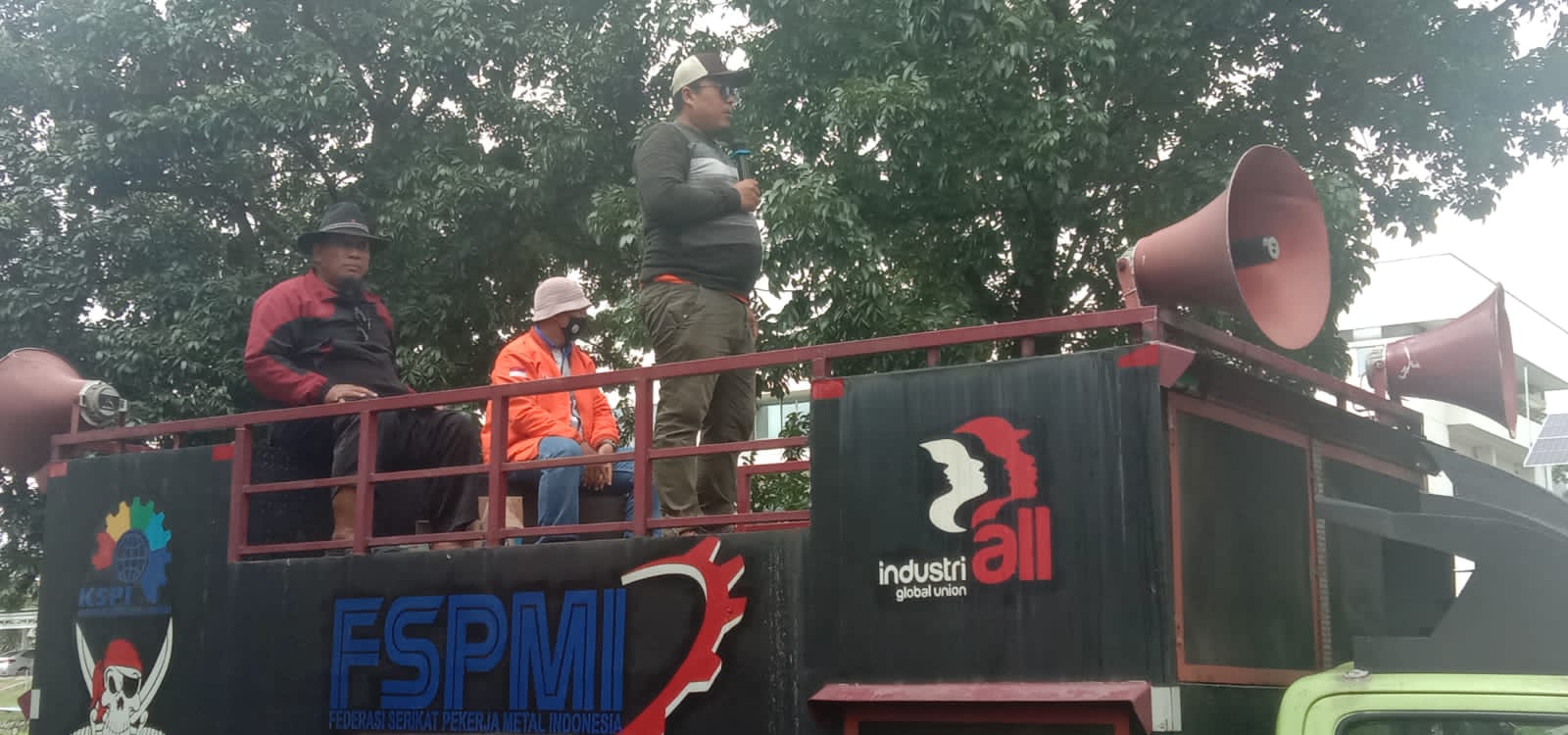 Selanjutnya Edy Kuncoro menyampaikan Orasi di atas Mobil Komando FSPMI yang harapan nya hari ini Perangkat PP SPAMK FSPMI bisa bertemu dan di Fasilitasi oleh Pihak Kepolisian bertemu dengan Pimpinan Perusahaan PT. GS Battery.