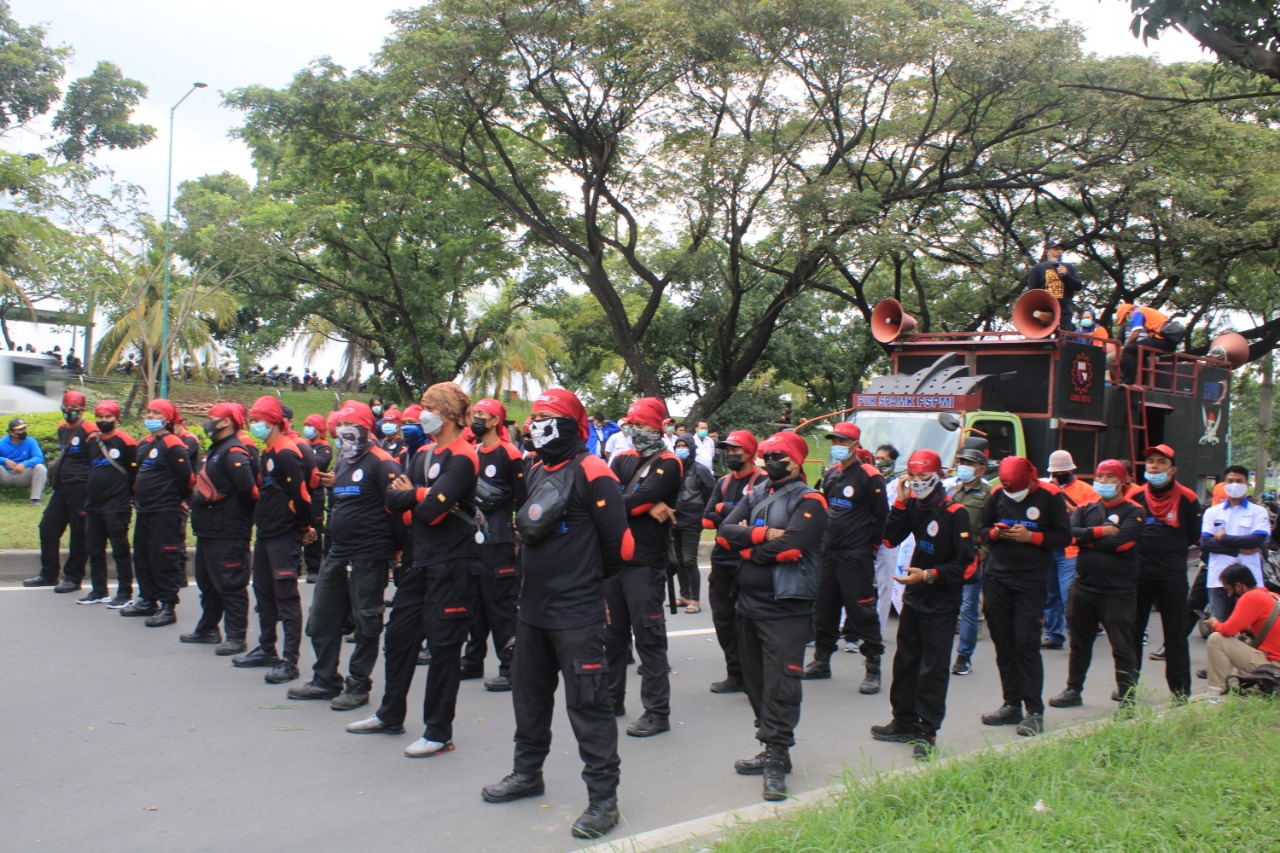 Terlihat Ratusan massa aksi dari berbagai daerah memadati Jalan utama Kawasan Surya Cipta di Depan PT. GS Battery Karawang yang berasal dari Jabodetabek (Jakarta, Bogor, Depok, Tangerang, Bekasi) dan daerah lainnya.