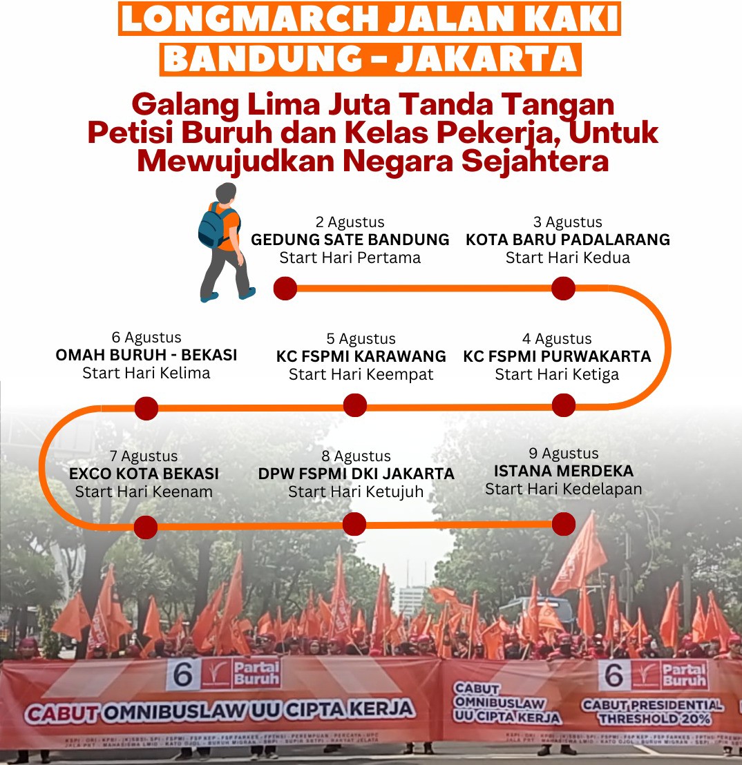 Supriyadi atau sering dipanggil ‘Piyong’ sebagai Panglima Koordinator Nasional Garda Metal FSPMI mengatakan bahwa agenda longmarch akan berawal dari gedung sate pada Rabu, (2/8/2023) dan berakhir (Finish) di Istana Negara, Rabu (9/8/2023).