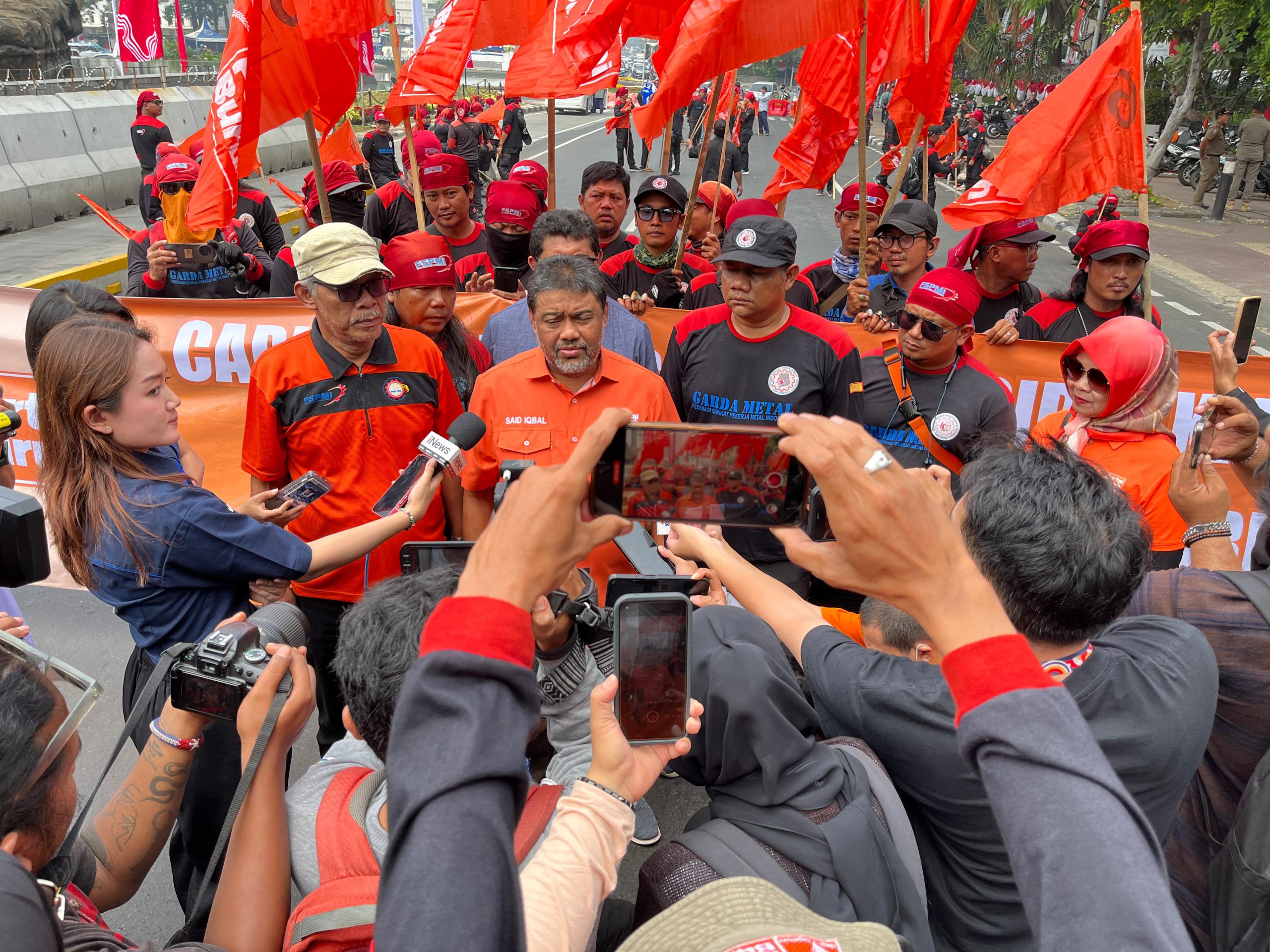 Aksi pun dihadiri oleh Presiden Partai Buruh Said Iqbal yang langsung mengadakan konferensi pers sebelum naik mobil komando untuk orasi. Sampai berita ini dirilis, aksi masih berlanjut. (Iksan)