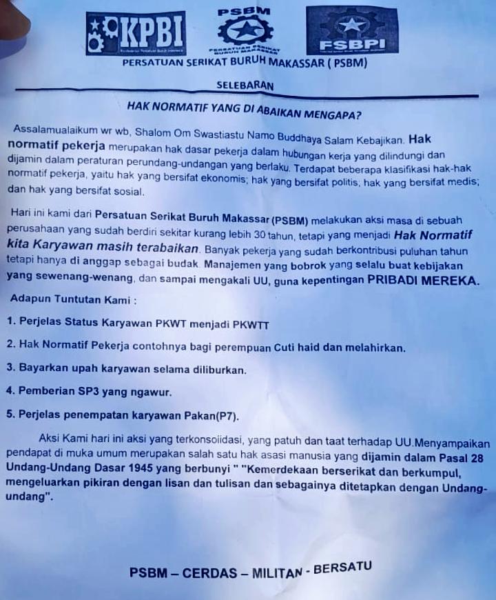 Pekerja dari PT. Wahyu Pradana Binamulia yang bergabung di Serikat Pekerja Persatuan Serikat Buruh Makassar (SP PSBM)
