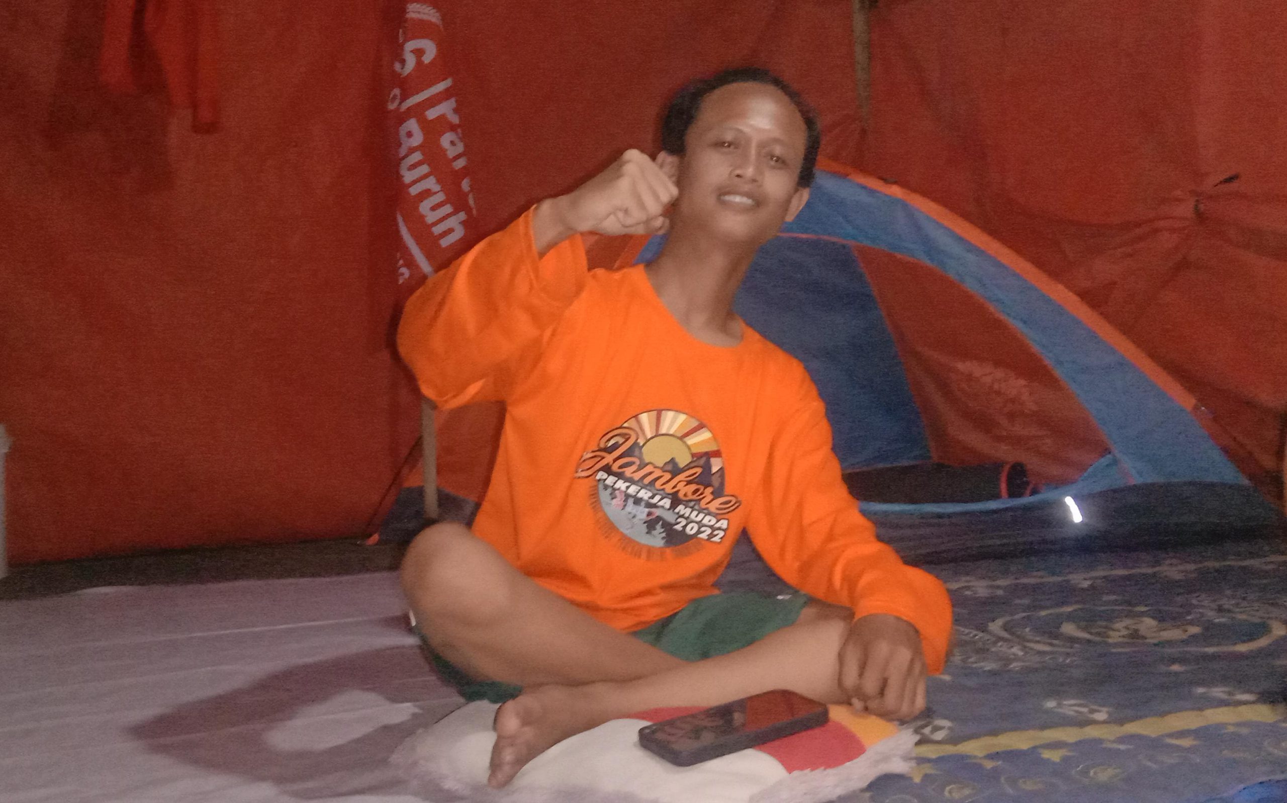 Subang, KPonline – Hari kelima di tenda juang Pimpinan Unit Kerja Serikat Pekerja Aneka Industri Federasi Serikat Pekerja Metal Indonesia PT Perikanan Indonesia Subang, (PUK SPAI FSPMI PT Perindo), Dusun Sidodadi, Ciasem Girang, Ciasem Subang, Di antara kumpulan tiga puluhan orang berkumpul di Tenda juang hari ini, Selasa malam, pukul 21.00 wib, tanggal 09 Juli 2024 ada salah satu angggota PUK SPAI FSPMI PT Perindo Subang namanya Ikhdam Awaludin Haromain, biasa di panggil Ikhdam.