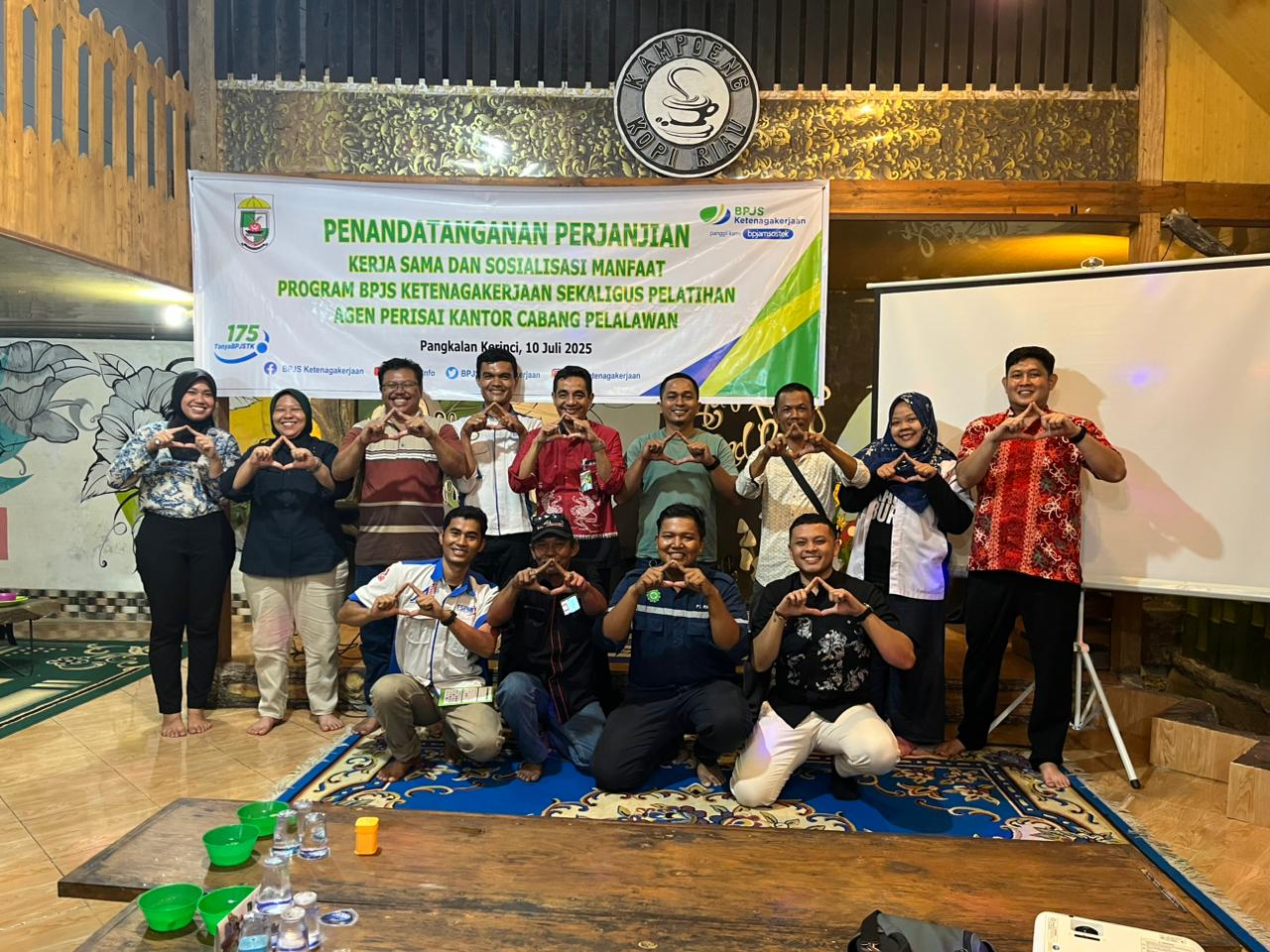 Fhoto Bersama Peserta Calon Agen perisai dari FSPMI bersama BPJS Ketenagakerjaan Cabang Pelalawan, Riau dalam Penandatanganan Kerja Bersama dan Sosialisasi Manfaat Jaminan BPJS Ketenagakerjaan yang dilaksanakan di Caffe Kampung Kopi, Pangkalan Kerinci, Pelawan Riau. Kamis (10/7/25). Fhoto : MP Pelalawan