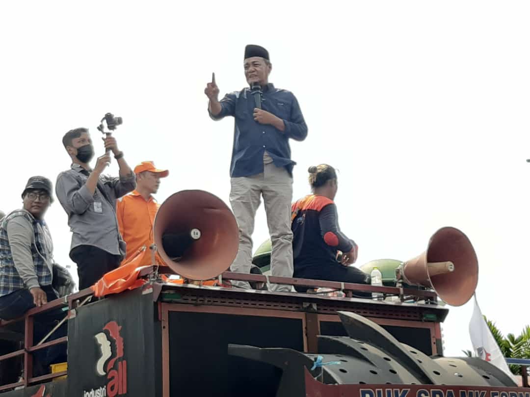 Sorak-sorak massa terdengar ketika di atas mobil komando terlihat salah satu anggota DPR RI, Komisi VIII, Obon Tabroni berorasi.