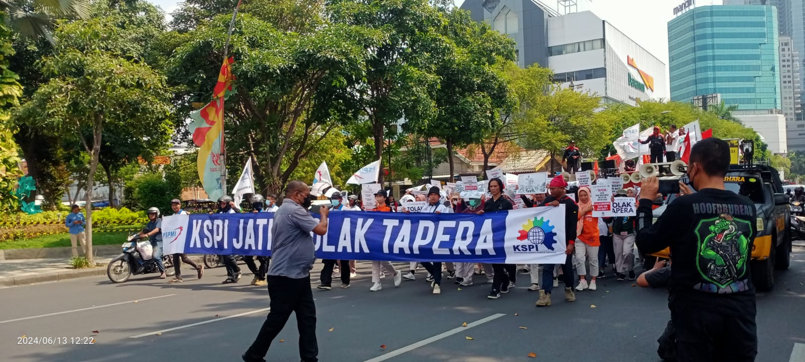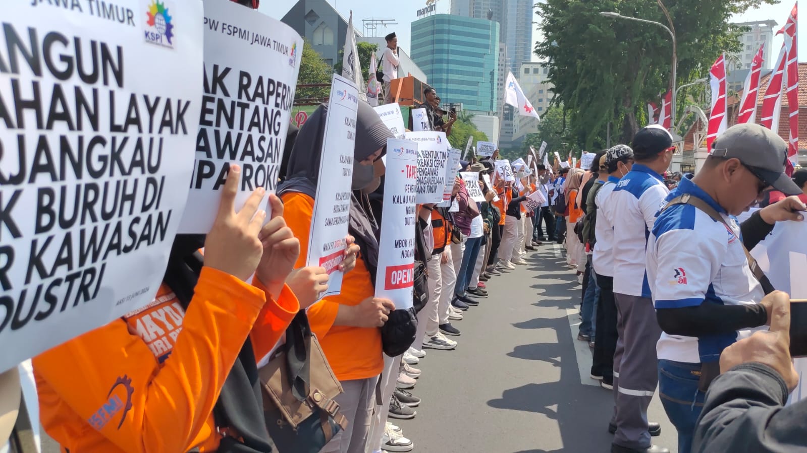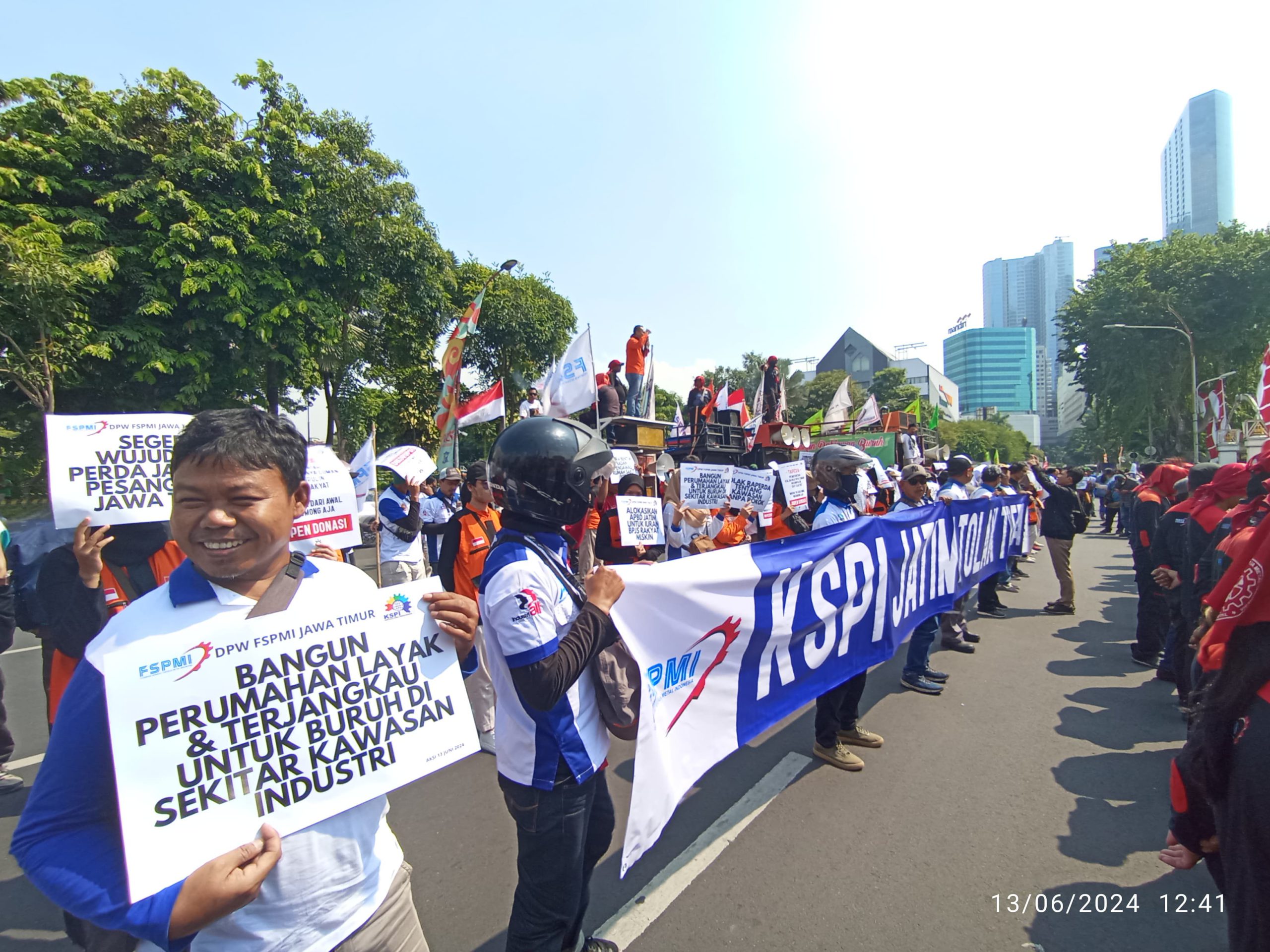 Surabaya, KPonline – Ribuan massa aksi dari Federasi Serikat Pekerja Metal Indonesia (FSPMI) yang tergabung dalam KSPI Jawa Timur turun ke jalan, menyuarakan aspirasinya di depan Kantor Negara Grahadi di Jl. Gubernur Suryo Surabaya, pada Kamis siang (13/6/2024).