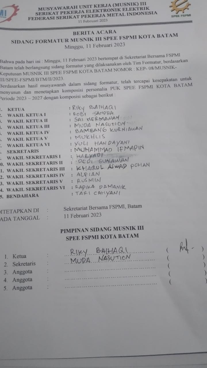 Batam,KPonline – Masih dalam acara MUsnik ke 3 PUK Amber Karya.Setelah melalui proses yang sudah diatur di tata cara ber Musnik,maka terpilihlah Ketua PUK Amber Karya yang baru di periode 2023 – 2025,yaitu Riki Baihaqi.
