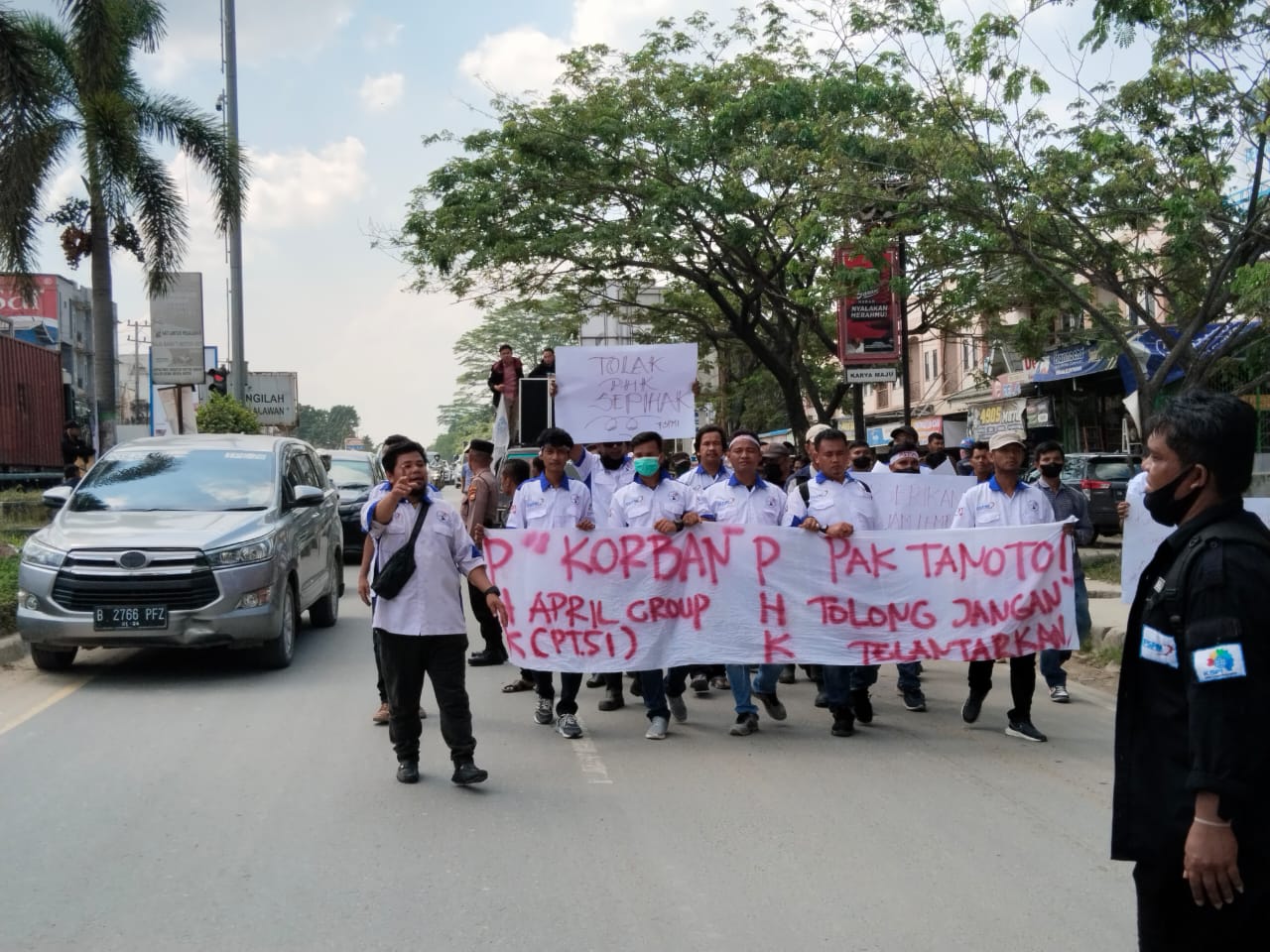 Massa aksi PUK SPDT FSPMI PT. PTSI dan dukungan dari kalangan Mahasiswa Pelalawan melakukan Demonstrasi di depan perusahaan besar Asia Tenggara (PT. RAPP) April Group, menyampaikan beberapa tuntutan atas di PHK sepihaknya Ketua PUK SPDT FSPMI PT. PTSI dalam membela dan memperjuangkan anggotanya