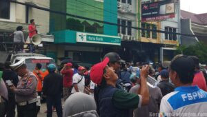 Surabaya, KPonline — Lebih dari 500 massa aksi dari berbagai daerah di Jawa Timur memadati Jalan Darmo, Surabaya, tepat di depan Kantor Cabang Pembantu (KCP) Bank Hana Darmo, Senin (10/11/2025). Aksi ini merupakan bentuk solidaritas terhadap nasib 13 pekerja PT Rama Gloria Kabupaten Pasuruan yang hingga kini belum menerima hak mereka setelah perusahaan tersebut dinyatakan pailit oleh pengadilan.