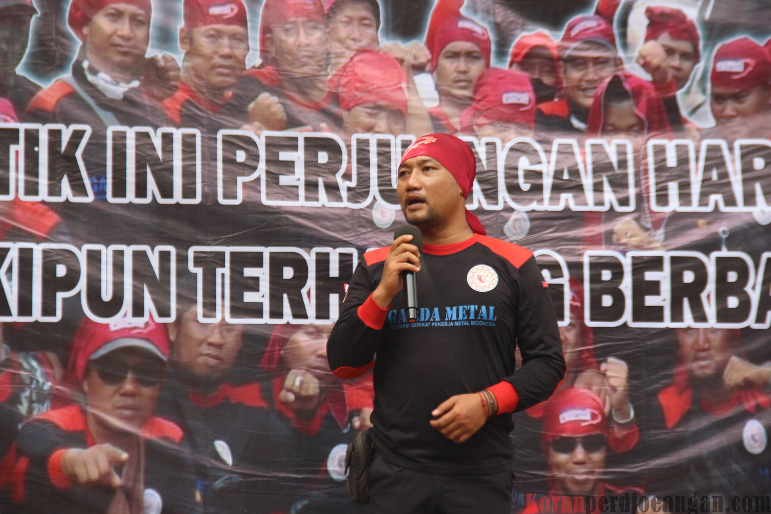 Koordinator Daerah Garda Metal FSPMI Kabupaten Karawang Dani Supardika dalam sambutannya menyampaikan harapannya bahwa setiap aksi upah di Karawang maupun di Bandung seperti ini terus kawan kawan yang datang.